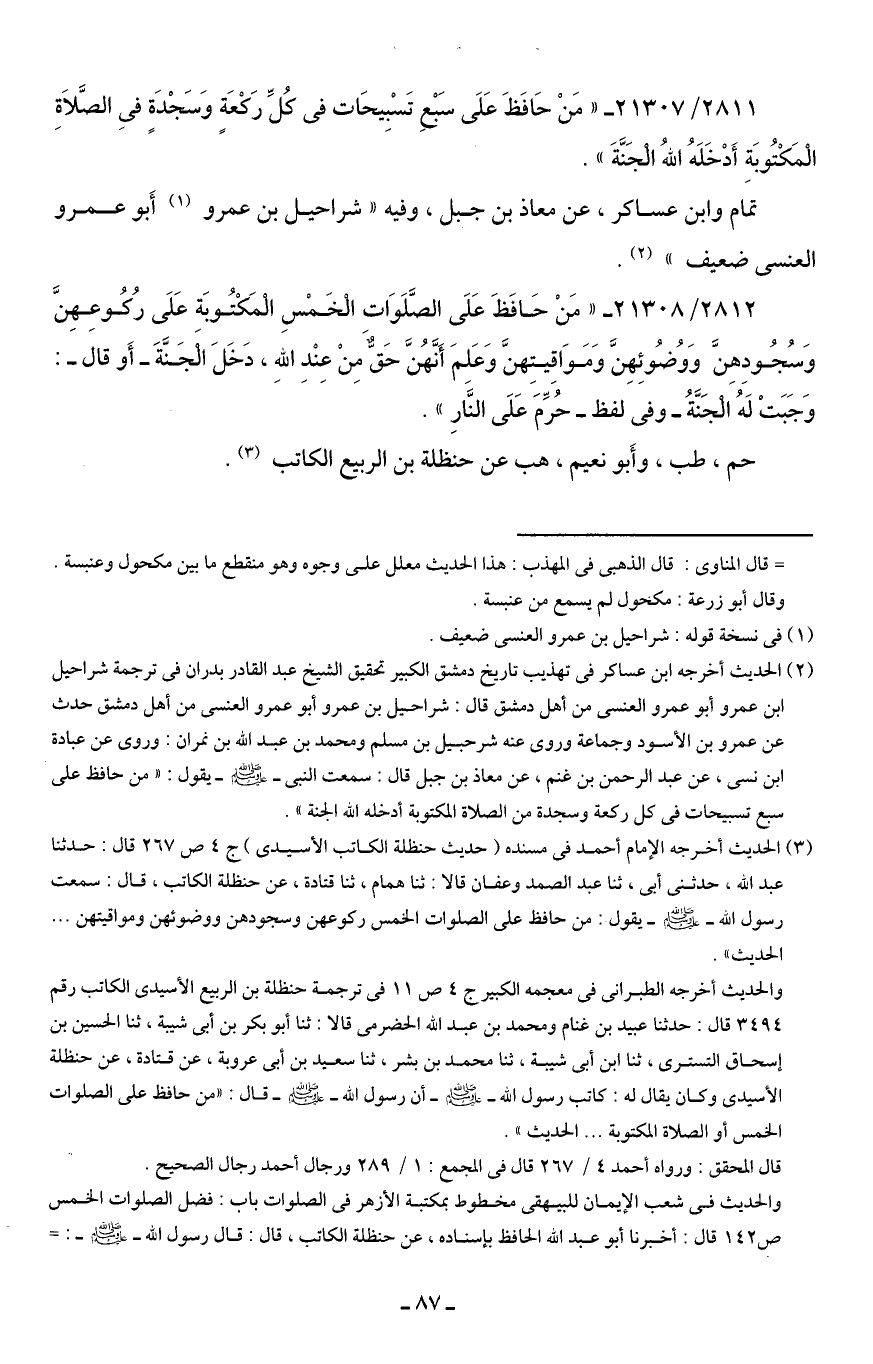 (¬3) الحديث أخرجه الإمام أحمد في مسنده (حديث حنظلة الكاتب الأسيدى) ج 4 ص 267 قال: حدثنا عبد الله، حدثني أبي، ثنا عبد الصمد وعفان قالا: ثنا همام، ثنا قتادة، عن حنظلة الكاتب، قال: سمعت رسول الله - صلى الله عليه وسلم - يقول: من حافظ على الصلوات الخمس ركوعهن وسجودهن ووضوئهن ومواقيتهن ... الحديث".
