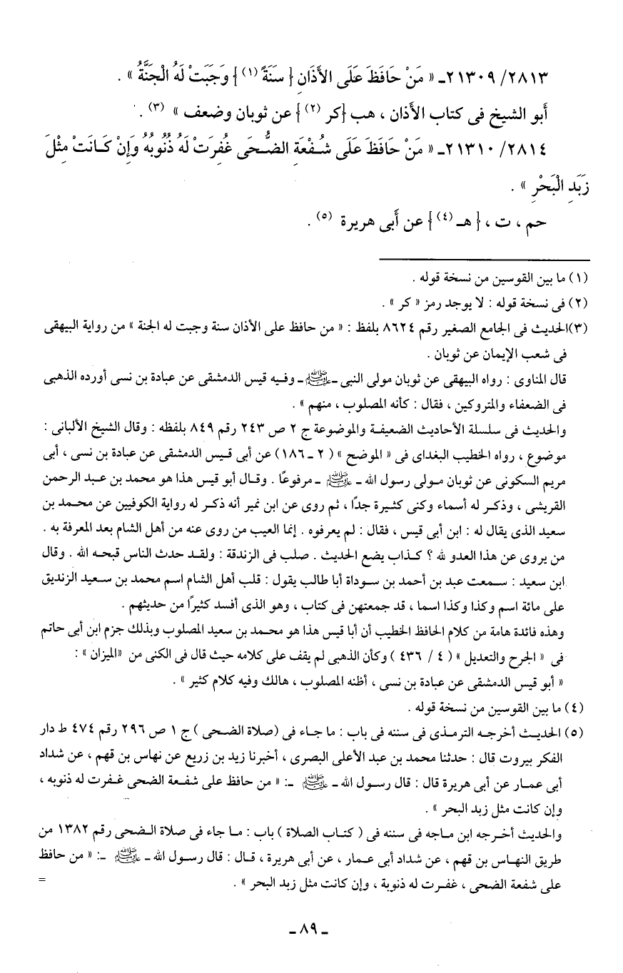 2814/ 21310 - "مَنْ حَافَظَ عَلَى شُفْعَةِ الضُّحَى غُفِرَتْ لَهُ ذُنُوبُهُ وَإِنْ كَانَتْ مِثْلَ زَبَدِ الْبَحْرِ".