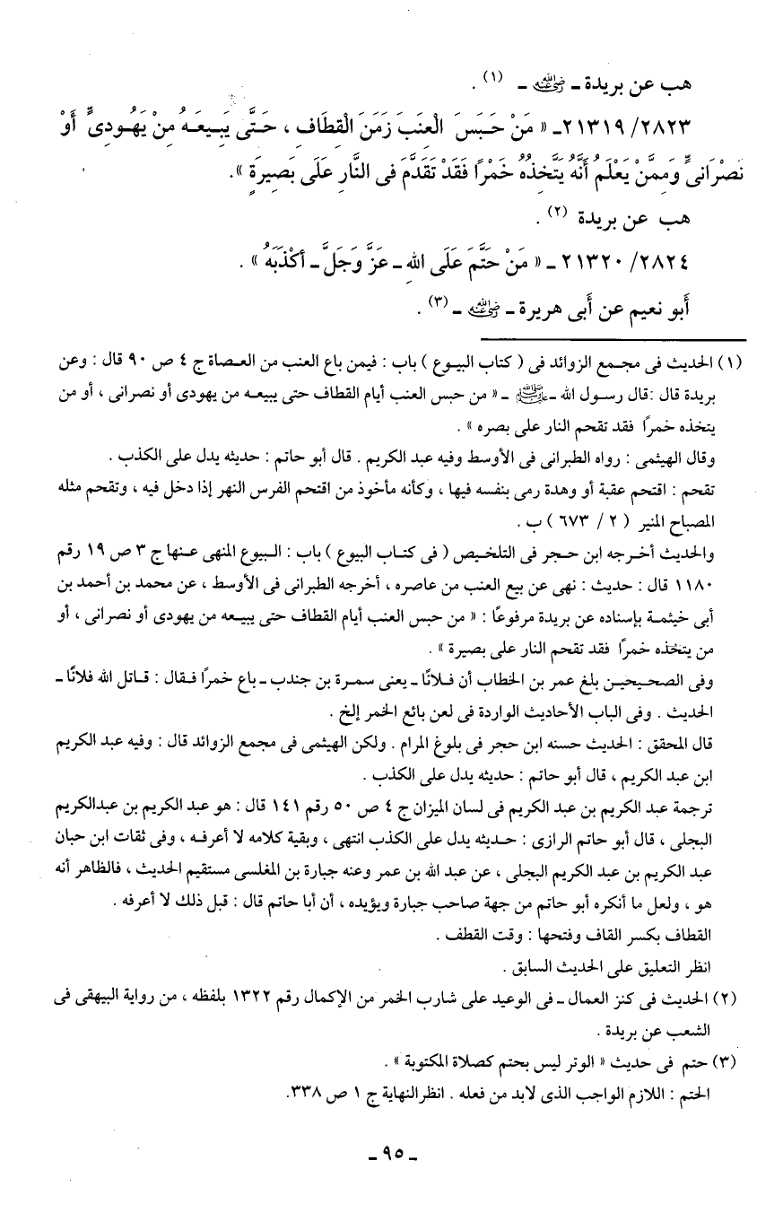 (¬1) الحديث في مجمع الزوائد في (كتاب البيوع) باب: فيمن باع العنب من العصاة ج 4 ص 90 قال: وعن بريدة قال: قال رسول الله - صلى الله عليه وسلم - "من حبس العنب أيام القطاف حتى يبيعه من يهودى أو نصرانى، أو من يتخذه خمرًا فقد تقحم النار على بصره".