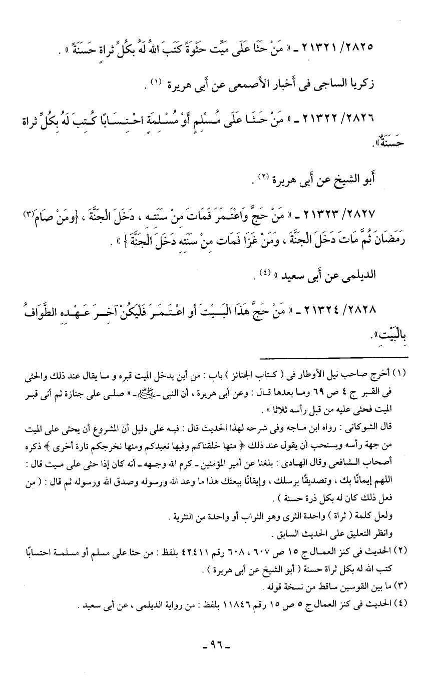 2825/ 21321 - "مَنْ حَثَا عَلَى ميِّت حَثْوَةً كتَبَ اللهُ لَهُ بكُلِّ ثراةٍ حَسَنَةً".