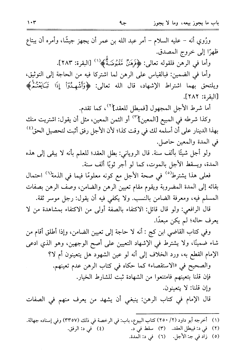 فعلى هذا يشترط في صحة الأجل مع كونه معلوماً فيما في الذمة احتمال بقائه إلى المدة المضروبة ويقوم مقام تعيين الرهن والضامن، وصف الرهن بصفات المسلم فيه، ومعرفة الضامن بالنسب. ولا يكفي فيه أن يقول: رجل موسر ثقة.