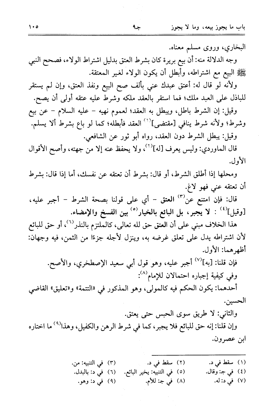 قال: فإن امتنع عن العتق – أي على قولنا بصحة الشرط – أجبر عليه، [وقيل]: لا يجبر، بل البائع بالخيار بني الفسخ والإمضاء.