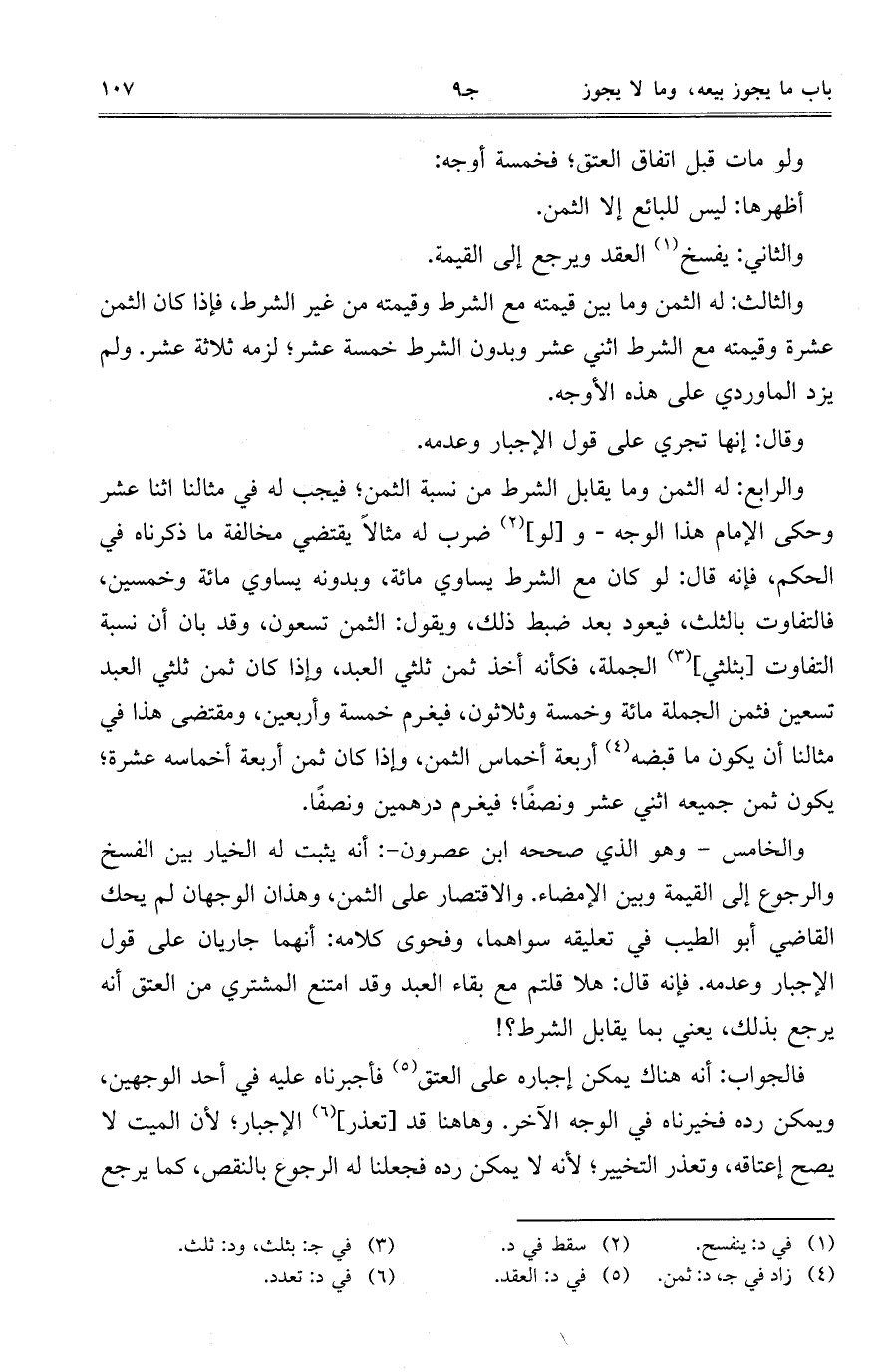 والخامس- وهو الذي صححه ابن عصرون -:أنه يثبت له الخيار بين الفسخ والرجوع إلى القيمة وبين الإمضاء. والاقتصار على الثمن، وهذان الوجهان لم يحك القاضي أبو الطيب في تعليقه سواهما، وفحوى كلامه: أنهما جاريان على قول الإجبار وعدمه. فإنه قال: هلا قلتم مع بقاء العبد وقد امتنع المشتري من العتق أنه يرجع بذلك، يعني بما يقابل الشرط؟!