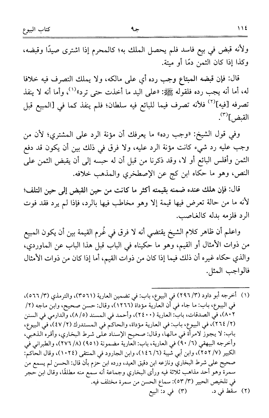 واعلم أن ظاهر كلام الشيخ يقتضي أنه لا فرق في غُرم القيمة بين أن يكون المبيع من ذوات الأمثال أو القيم، وهو ما حكيناه في الباب قبل هذا الباب عن الماوردي، والذي حكاه غيره أن ذلك فيما إذا كان من ذوات القيم، أما إذا كان من ذوات الأمثال فالواجب المثل.