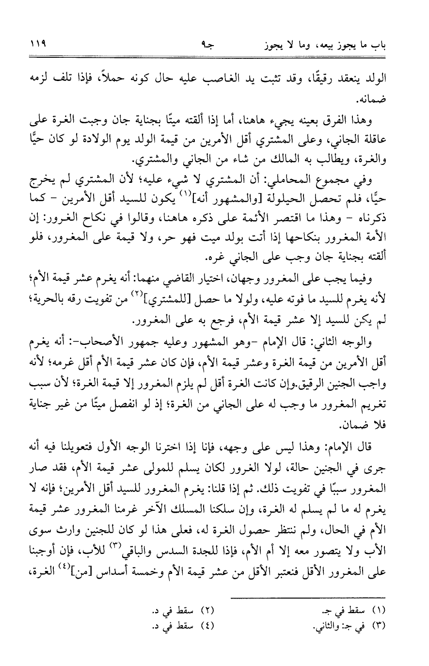 وفي مجموع المحاملي: أن المشتري لا شيء عليه؛ لأن المشتري لم يخرج حيًّا، فلم تحصل الحيلولة [والمشهور أنه] يكون للسيد أقل الأمرين – كما ذكرناه – وهذا ما اقتصر الأئمة على ذكره هاهنا، وقالوا في نكاح الغرور: إن الأمة المغرور بنكاحها إذا أتت بولد ميت فهو حر، ولا قيمة على المغرور، فلو ألقته بجناية جان وجب على الجاني غره.