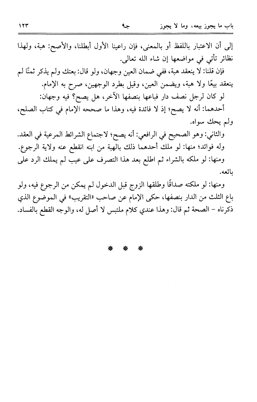 ومنها: لو ملكته صداقاً وطلقها الزوج قبل الدخول لم يمكن من الرجوع فيه، ولو باع الثلث من الدار بنصفها، حكى الإمام عن صاحب "التقريب" في الموضع الذي ذكرناه – الصحة ثم قال: وهذا عندي كلام ملتبس لا أصل له، والوجه القطع بالفساد.