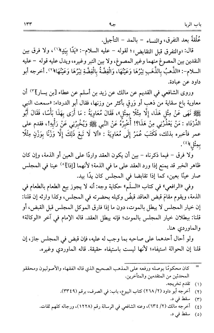 وروى الشافعي في القديم عن مالك عن زيد بن أسلم عن عطاء [بن يسار] أن معاوية باع سقاية من ذهب أو وَرِقٍ بأكثر من وزنها، فاقل أبو الدرداء: "سمعت النبي صلى الله عليه وسلم نَهَى عَنْ مِثْلِ هَذَا، إِلاَّ مِثْلاً بِمِثْلٍ"، فَقَالَ مُعَاوِيَةُ: مَا أَرَى بِهَذَا بَاساً، فَقَالَ أَبُو الدَّرْدَاءِ: مَنْ يَعْذُرُنِي مِنْ هَذَا؟! أُخْبِرُهُ عَنْ النَّبي صلى الله عليه وسلم وَيُخْبِرُنِي عَنْ رَايِهِّ، قدم على عمر فأخبره بذلك، فَكَتَب عُمَرُ إلَى مُعَاوِيَةَ: "ألا لاَ تَبِعْ ذَلِكَ إِلاَّ وَزْناً بِوَزْنٍ مِثْلاً بِمِثْلٍ".