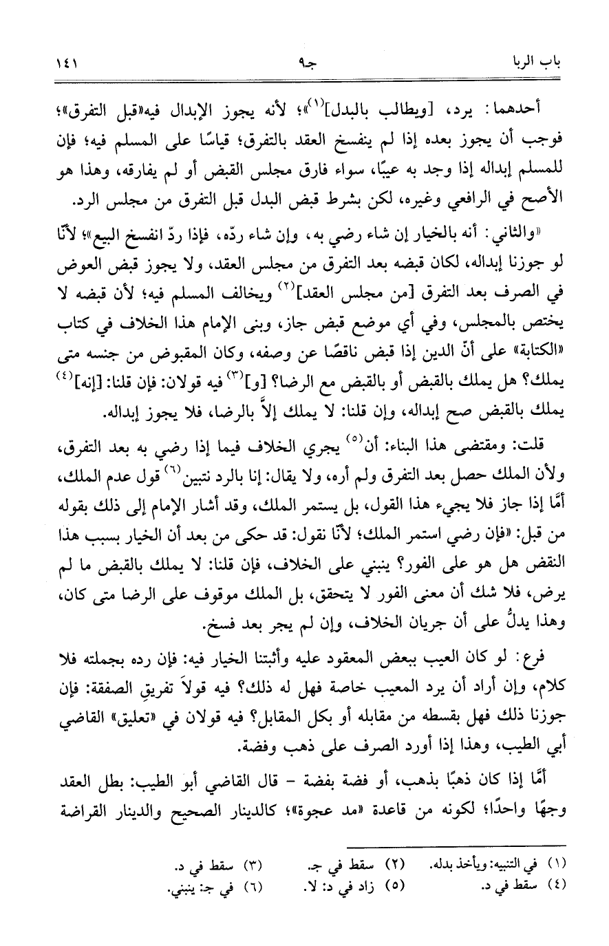 أحدهما: يرد، [ويطالب بالبدل] "؛ لأنه يجوز الإبدال فيه "قبل التفرق"؛ فوجب أن يجوز بعده إذا لم ينفسخ العقد بالتفرق؛ قياساً على المسلم فيه؛ فإن للمسلم إبداله إذا وجد به عيباً، سواء فارق مجلس القبض أو لم يفارقه، وهذا هو الأصح في الرافعي وغيره، لكن بشرط قبض البدل قبل التفرق من مجلس الرد.