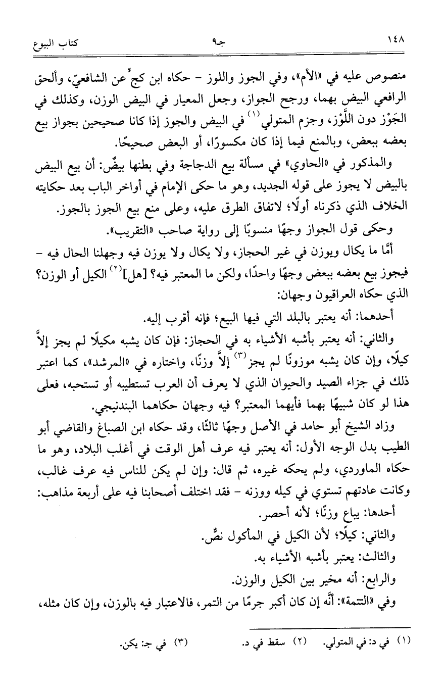 وزاد الشيخ أبو حامد في الأصل وجهاً ثالثاً، وقد حاكه ابن الصباغ والقاضي أبو الطيب بدل الوجه الأول: أنه يعتبر فيه عرف أهل الوقت في أغلب البلاد، وهو ما حكاه الماوردي، ولم يحكه غيره، ثم قال: وإن لم يكن للناس فيه عرف غالب، وكانت عادتهم تستوي في كيله ووزنه – فقد اختلف أصحابنا فيه على أربعة مذاهب:
