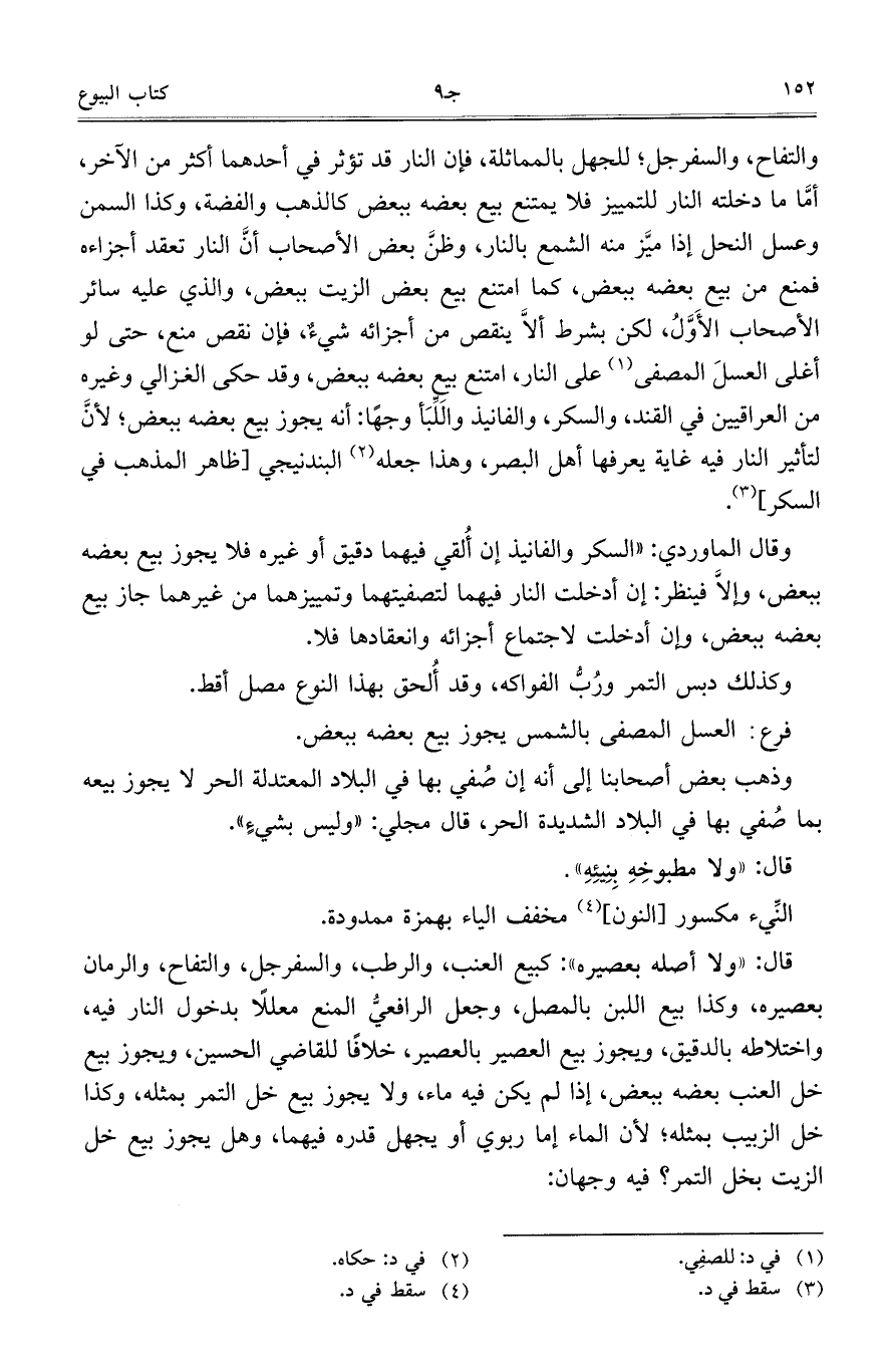 والتفاح، والسفرجل؛ للجهل بالمماثلة، فإن النار قد تؤثر في أحدهما أكثر من الآخر، أمَّا ما دخلته النار للتمييز فلا يمتنع بيع بعضه ببعض كالذهب والفضة، وكذا السمن وعسل النحل إذا ميَّز منه الشمع بالنار، وظنَّ بعض الأصحاب أنَّ النار تعقد أجزاءه فمنع من بيع بعضه ببعض، كما امتنع بيع بعض الزيت ببعض، والذي عليه سائر الأصحاب الأوَّلُ، لكن بشرط ألاَّ ينقص من أجزائه شيءٌ، فإن نقص منع، حتى لو أغلى العسلَ المصفى على النار، امتنع بيع بعضه ببعض، وقد حكى الغزالي وغيره من العراقيين في القند، والسكر، والفانيذ واللِّبَأ وجهاً: أنه يجوز بيع بعض ببعض؛ لأنَّ لتأثير النار فيه غاية يعرفها أهل البصر، وهذا جعله البندنيجي [ظاهر المذهب في السكر].