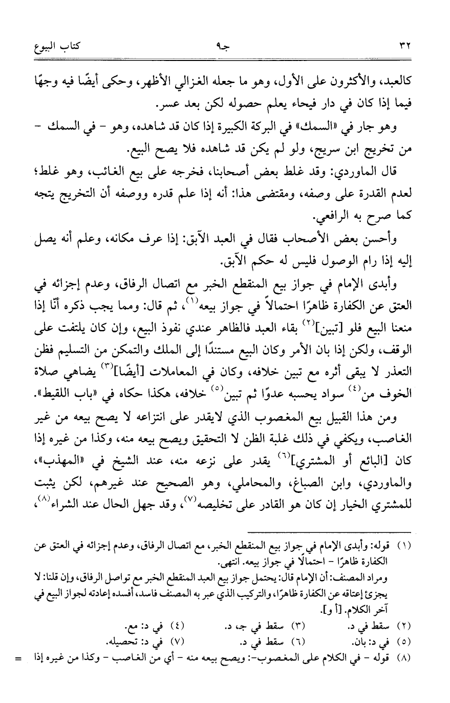 وأبدى الإمام في جواز بيع المنقطع الخبر مع اتصال الرفاق، وعدم إجزائه في العتق عن الكفارة ظاهراً احتمالاً في جاوز بيعه، ثم قال: ومما يجب ذكره أنّا إذا منعنا البيع فلو [تبين] بقاء العبد فالظاهر عندي نفوذ البيع، وإن كان يلتفت على الوقف، ولكن إذا بان الأمر وكان البيع مستنداً إلى الملك والتمكن من التسليم فظن التعذر لا يبقى أثره مع تبين خلافه، وكان في المعاملات [أيضاً] يضاهي صلاة الخوف من سواد يحبسه عدواً ثم تبين خلافه، هكذا حكاه في "باب اللقيط".