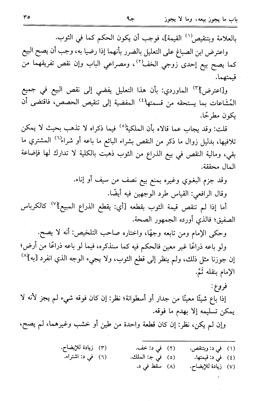 قلت: وقد يجاب عما قالاه بأن الملكية فيما ذكراه لا تذهب بحيث لا يمكن تلافيها، بدليل زوال ما ذكر من النقص بشراء البائع ما باعه أو شراء المشتري ما بقي، ومالية النقص في بيع الذراع من الثوب ذهبت بالكلية لا تدارك لها فإضاعة المال محققة.