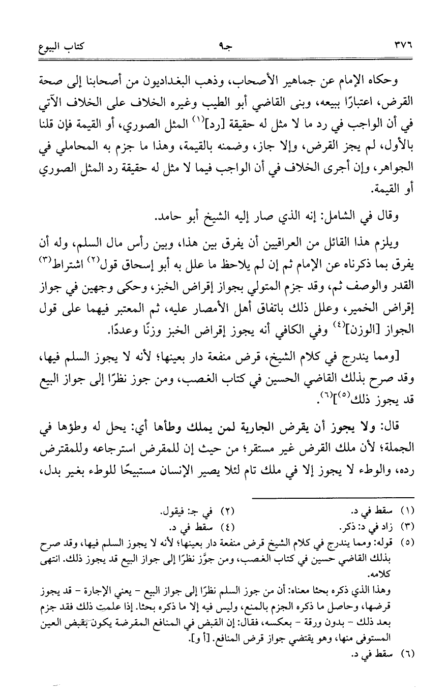 وحكاه الإمام عن جماهير الأصحاب، وذهب البغداديون من أصحابنا إلى صحة القرض، اعتباراً ببيعه، وبنى القاضي أبو الطيب وغيره الخلاف على الخلاف الآتي في أن الواجب في رد ما لا مثل له حقيقة [رد] المثل الصوري، أو القيمة فإن قلنا بالأول، لم يجز القرض، وإلا جاز القرض، وإلا جاز، وضمنه بالقيمة، وهذا ماجزم به المحاملي في الجواهر، وإن أجرى الخلاف في أن الواجب فيما لا مثل له حقيقة رد المثل الصوري أو القيمة.