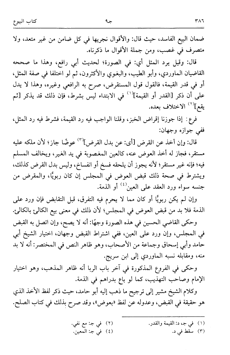 قال: وقيل يرد المثل أي: في الصورة؛ لحديث أبي رافع، وهذا ما صححه القاضيان الماوردي، وأبو الطيب، والبغوي والأكثرون، ثم لو اختلفا في صفة المثل، أو في قدر القيمة، فالقول قول المستقرض، صرح به الرافعي وغيره، وهذا لا يدل على أن ذكر [القدر أو القيمة] في الابتداء ليس بشرط، فإن ذلك قد يذكر [ثم يقع] الاختلاف بعده.