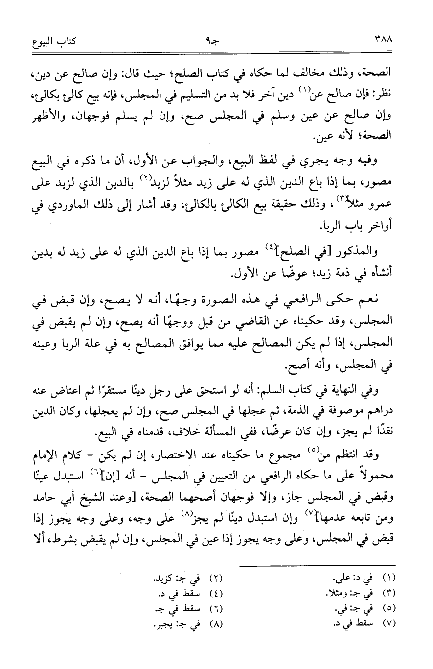 وقد انتظم من مجموع ما حكيناه عند الاختصار، إن لم يكن – كلام الإمام محمولاً على ما حاكه الرافعي من التعيين في المجلس – أنه [إن] استبدل عيناً وقبض في المجلس جاز، وألا فوجهان أصحهما الصحة، [وعند الشيخ أبي حامد ومن تابعه عدمها] وإن استبدل ديناً لم يجز على وجه، وعلى وجه يجوز إذا قبض في المجلس، وعلى وجه يجوز إذا عين في المجلس، وإن لم يقبض بشرط، ألا