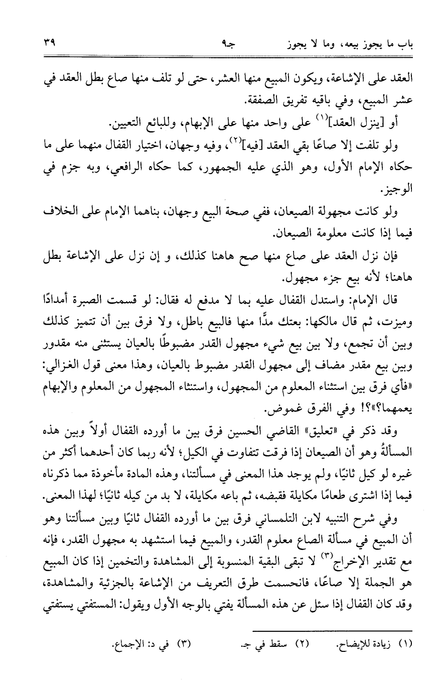 وفي شرح التنبيه لابن التلمساني فرق بين ما أورده القفال ثانياً وبين مسألتنا وهو أن المبيع في مسألة الصاع معلوم القدر، والمبيع فيما استشهد به مجهول القدر، فإنه مع تقدير الإخراج لا تبقى البقية المنسوبة إلى المشاهدة والتخمين إذا كان المبيع هو الجملة إلا صاعاً، فانحسمت طرق التعريف من الإشاعة بالجزئية والمشاهدة، وقد كان القفال إذا سئل عن هذه المسألة يفتي بالوجه الأول ويقول: المستفتي يستفتي