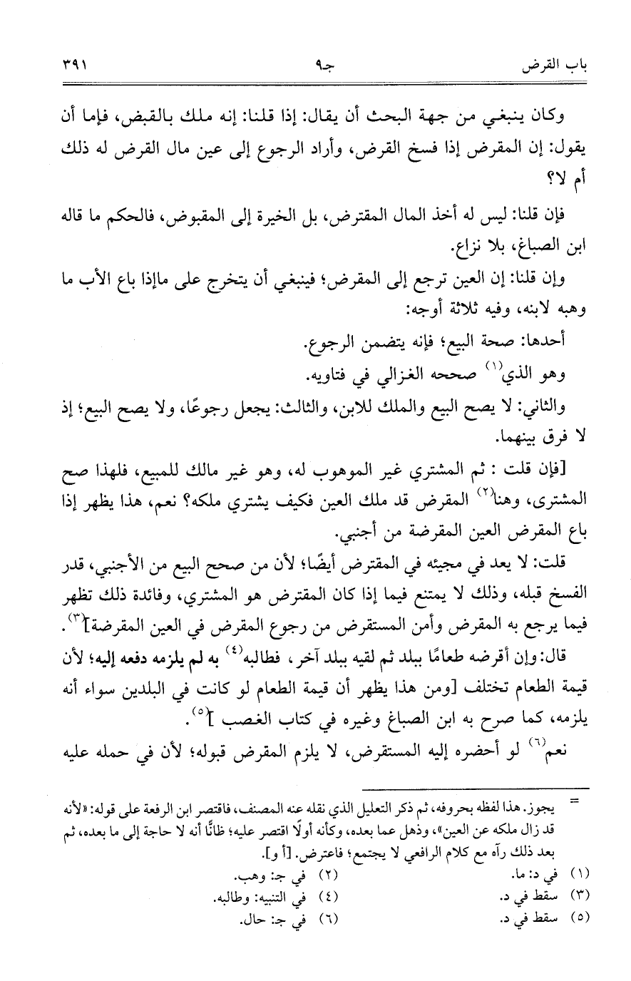 قلت: لا يعد في مجيئه في المقترض أيضاً؛ لأن من صحح البيع من الأجنبي، قدر الفسخ قبله، وذلك لا يمتنع فيما إذا كان المقترض هو المشتري، وفائدة ذلك تظهر فيما يرجع به المقرض وأمن المستقرض من رجوع المقرض في العين المقرضة].
