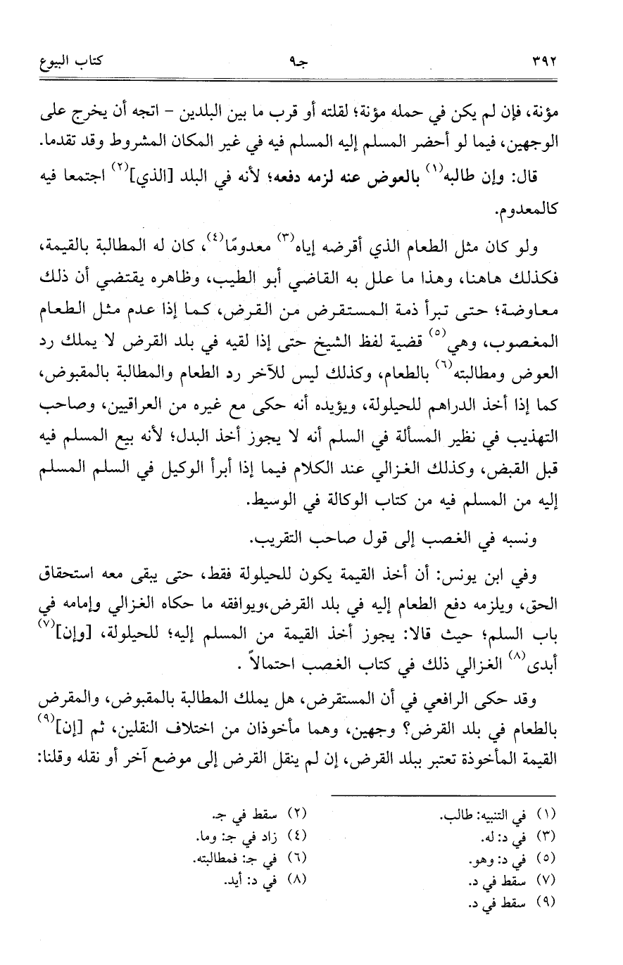 ولو كان مثل الطعام الذي أقرضه إياه معدوماً، كان له المطالبة بالقيمة، فكذلك هاهنا، وهذا ما علل به القاضي أبو الطيب، وظاهره يقتضي أن ذلك معاوضة؛ حتى تبرأ ذمة المستقرض من القرض، كما إذا عدم مثل الطعام المغصوب، وهي قضية لفظ الشيخ حتى إذا لقيه في بلد القرض لا يملك رد العوض ومطالبته بالطعام، وكذلك ليس للآخر رد الطعام والمطالبة بالمقبوض، كما إذا أخذ الدراهم للحيلولة، ويؤيده أنه حكى مع غيره من العراقيين، وصاحب التهذيب في نظير المسألة في السلم أنه لا يجوز أخذ البدل؛ لأنه بيع المسلم فيه قبل القبض، وكذلك الغزالي عند الكلام فيما إذا أبرأ الوكيل في السلم المسلم إليه من المسلم فيه من كتاب الوكالة في الوسيط.