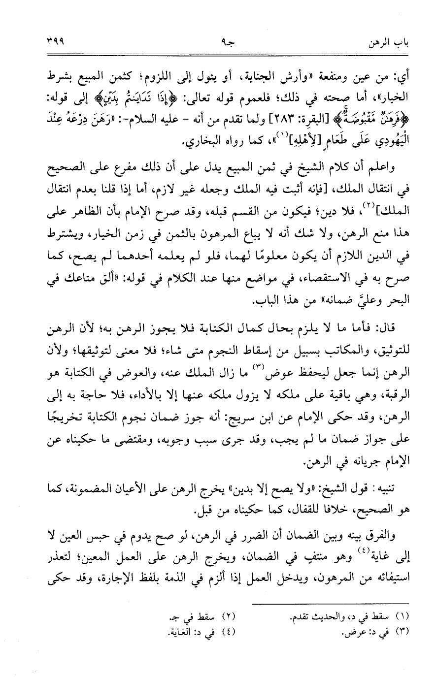 أي: من عين ومنفعة "وأرش الجناية"، أو يئول إلى اللزوم؛ كثمن المبيع بشرط الخيار"، أما صحته في ذلك؛ فلعموم قوله تعالى: - إِذَا تَدَايَنتُمْ بِدَيْنٍ} إلى قوله: - فَرِهَانٌ مَقْبُوضَةٌ} [البقرة:283] ولما تقدم من أنه - عليه السلام -: "رَهَنَ دِرْعَهُ عِنْدَ الْيَهُودِي عَلَى طَعَامٍ [لأِهْلِهِ] "، كما رواه البخاري.