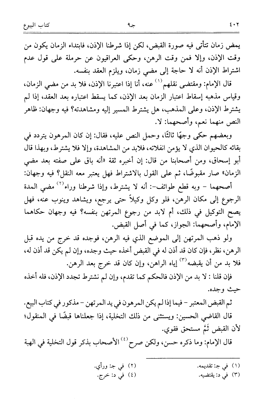 قال الإمام: ومقتضى نقلهم عنه، أنا إذا اعتبرنا الإذن، فلابد من مضي الزمان، وقياس مذهبه إسقاط اعتبار الزمان بعد الإذن، كما يسقط اعتباره بعد العقد، إذا لم يشترط الإذن، وعلى المذهب، هل يشترط المسير إليه ومشاهدته؟ فيه وجهان: ظاهر النص منهما نعم، وأصحهما: لا.
