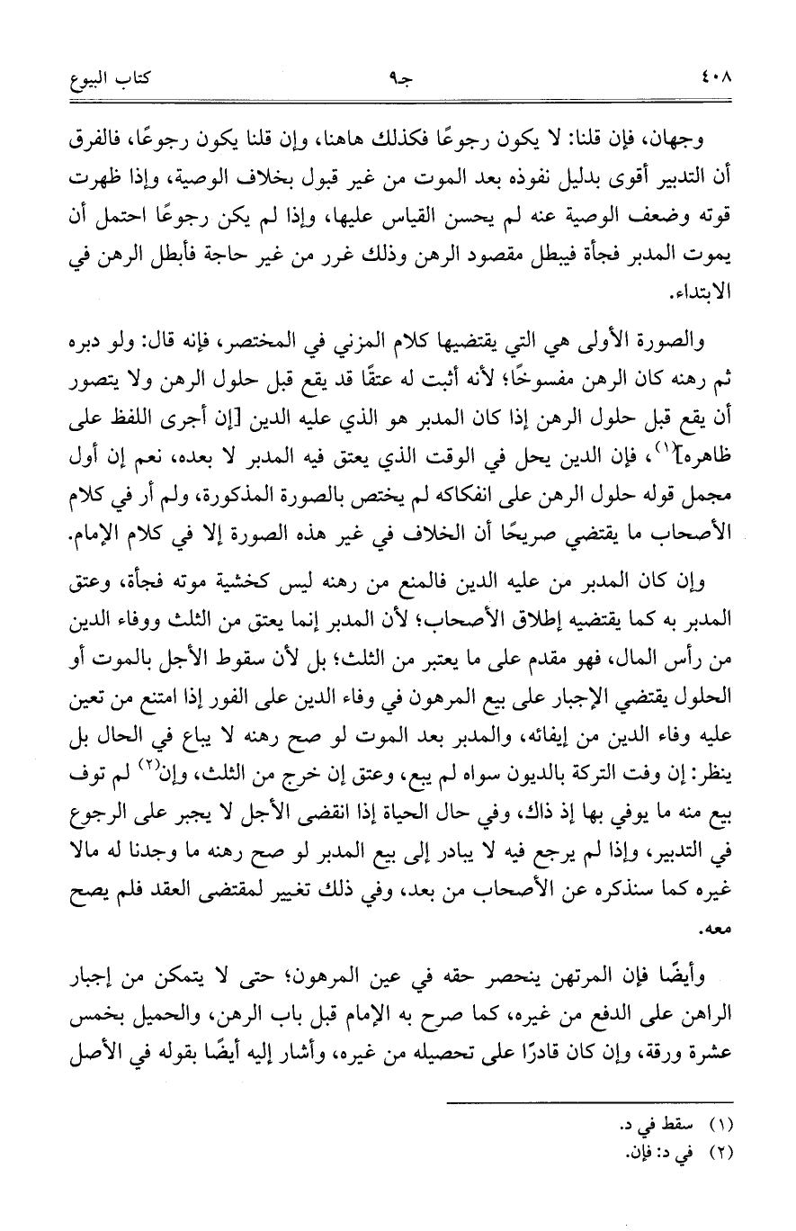 وإن كان المدبر من عليه الدين فالمنع من رهنه ليس كخشية موته فجأة، وعتق المدبر به كما يقتضيه إطلاق الأصحاب؛ لأن المدبر إنما يعتق من الثلث ووفاء الدين من رأس المال، فهو مقدم على ما يعتبر من الثلث؛ بل لأن سقوط الأجل بالموت أو الحلول يقتضي الإجبار على بيع المرهون في وفاء الدين على الفور إذا امتنع من تعين عليه وفاء الدين من إيفائه، والمدبر بعد الموت لو صح رهنه لا يباع في الحال بل ينظر: إن وفت التركة بالديون سواه لم يبع، وعتق إن خرج من الثلث، وإن لم توف بيع منه ما يوفى بها إذ ذاك، وفي حال الحياة إذا انقضى الأجل لا يجبر على الرجوع في التدبير، وإذا لم يرجع فيه لا يبادر إلى بيع المدبر لو صح رهنه ما وجدنا له مالا غيره كما سنذكره عن الأصحاب من بعد، وفي ذلك تغيير لمقتضى العقد فلم صح معه.