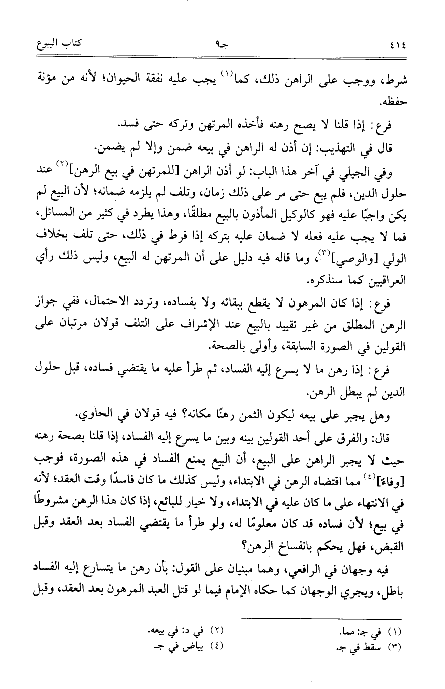 قال: والفرق على أحد القولين بينه وبين ما يسرع إليه الفساد، إذا قلنا بصحة رهنه حيث لا يجبر الراهن على البيع، أن البيع يمنع الفساد في هذه الصورة، فوجب [وفاءً] مما اقتضاه الرهن في الابتداء، وليس كذلك ما كان فاسداً وقت العقد؛ لأنه في الانتهاء على ما كان عليه في الابتداء، ولا خيار للبائع، إذا كان هذا الرهن مشروطاً في بيع؛ لأن فساده قد كان معلوماً له، ولو طرأ ما يقتضي الفساد بعد العقد وقبل القبض، فهل يحكم بانفساخ الرهن؟