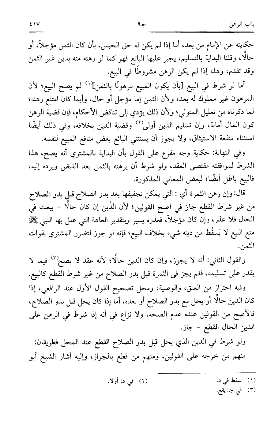 وفيه احتراز من العتق، والوصية، ومحل تصحيح القول الأول عند الرافعي، إذا كان الدين حالاًّ أو يحل مع بدو الصلاح أوب عده، أما إذا كان يحل قبل بدو الصلاح، فالأصح من القولين عنده عدم الصحة، ولا نزاع في أنه إذا شرط في الرهن على الدين الحال القطع – جاز.