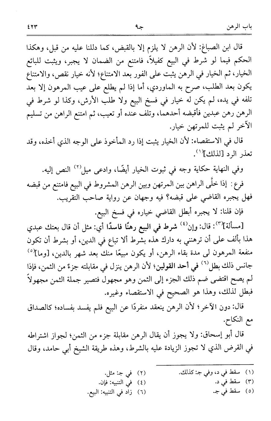 [مسألة]: قال: وإن شرط البيع رهناً فاسداً أي: مثل أن قال بعتك عبدي هذا بألف على أن ترهنني به دارك هذه بشرط ألا تباع في الدين، أو بشرط أن تكون منفعة المرهون لي مدة بقاء الرهن، أو يكون مبيعاً منك بعد شهر بالدين، [وما] جانس ذلك بطل في أحد القولين؛ لأن الرهن ينزل في مقابلته جزءٌ من الثمن، فإذا لم يصح اقتضى ضم ذلك الجزء إلى الثمن وه ومجهول فتصير جملة الثمن مجهولاً فبطل لذلك، وهذا هو الصحيح في الاستقصاء وغيره.