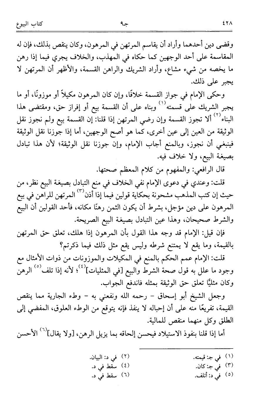 وحكى الإمام في جواز القسمة خلافاً، وإن كان المرهون مكيلاً أو موزوناً، أو ما يجبر الشريك على قسمته وبناه على أن القسمة بيع أو إفراز حق، ومقتضى هذا البناء ألا تجوز القسمة وإن رضي المرتهن إذا قلنا: إن القسمة بيع ولم نجوز نقل الوثيقة من العين إلى عين أخرى، كما هو أصح الوجهين، أما إذا جوزنا نقل الوثيقة فينبغي أن نجوز، وبالمنع أجاب الإمام، وإن جوزنا نقل الوثيقة؛ لأن هذا تبادل بصيغة البيع، ولا خلاف فيه.