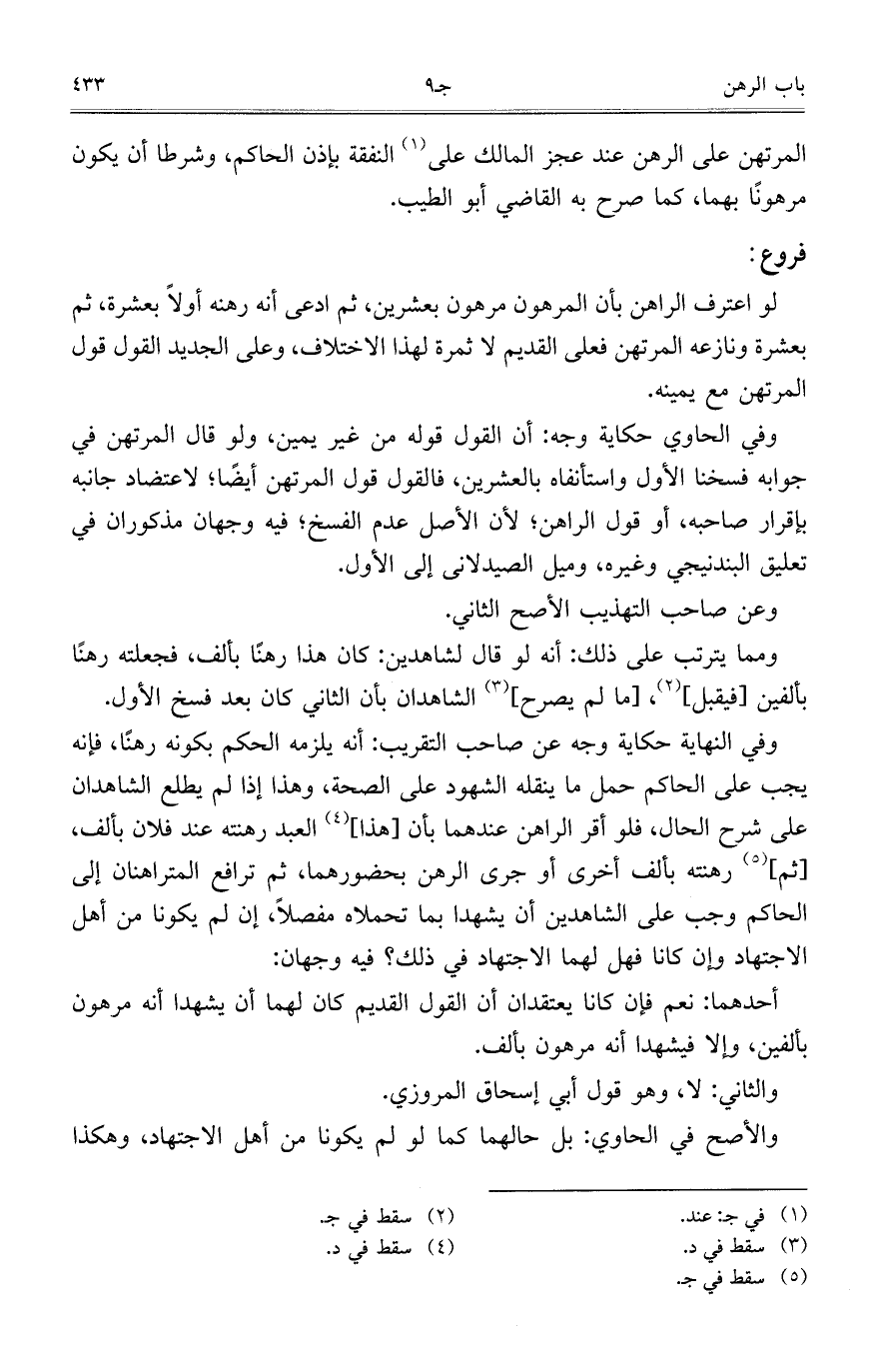 المرتهن على الرهن عند عجز المالك على النفقة بإذن الحاكم، وشرطا أن يكون مرهوناً بهما، كما صرح به القاضي أبو الطيب.