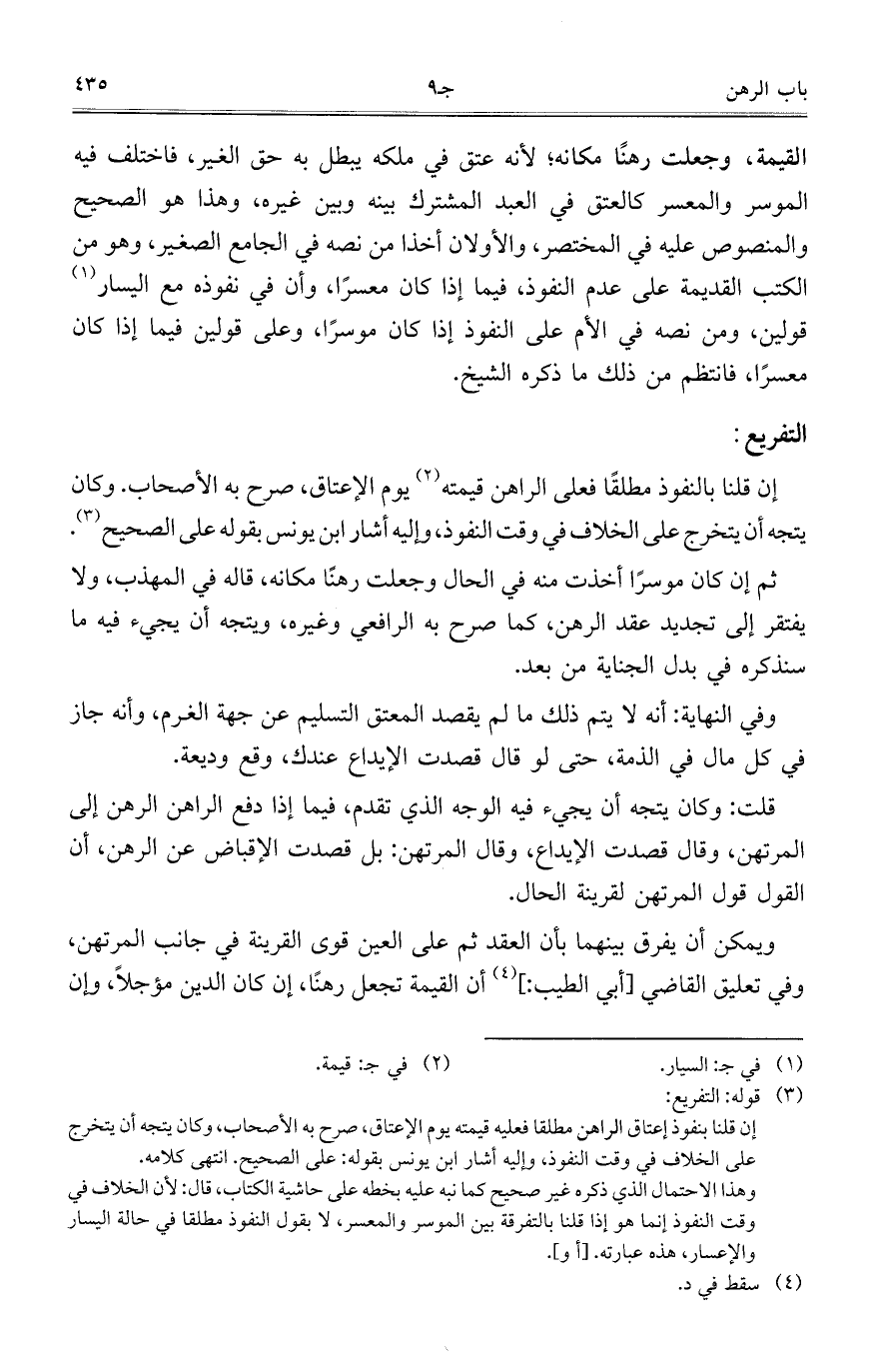 القيمة، وجعلت رهناً مكانه؛ لأنه عتق في ملكه يبطل به حق الغير، فاختلف فيه الموسر والمعسر كالعتق في العبد المشترك بينه وبين غيره، وهذا هوا لصحيح والمنصوص عليه في المختصر، والأولان أخذا من نصه في الجامع الصغير، وهو من الكتب القديمة على عدم النفوذ، فيما إذا كان معسراً، وأن في نفوذه مع اليسار قولين، ومن نصه في الأم على النفوذ إذا كان موسراً، وعلى قولين فيما إذا كان معسراً، فانتظم من ذلك ما ذكره الشيخ.