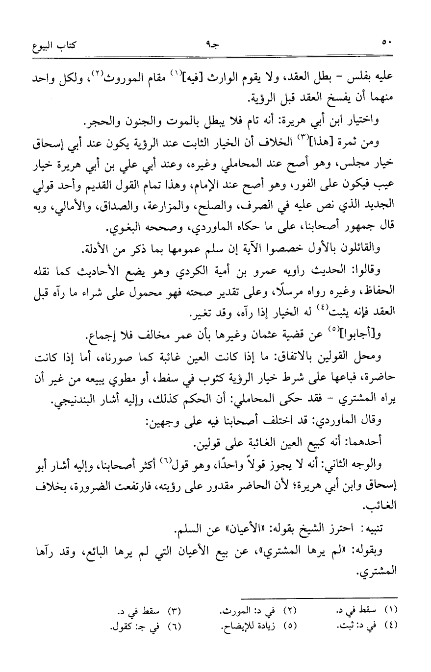 عليه بفلس - بطل العقد، ولا يقوم الوارث [فيه] مقام الموروث، ولكل واحد منهما أن يفسخ العقد قبل الرؤية.