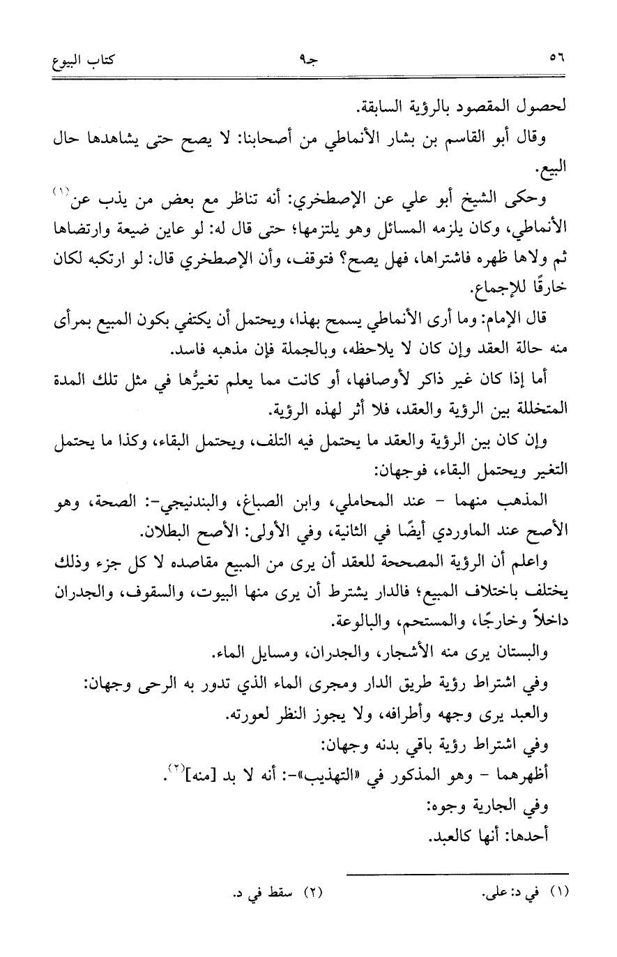 واعلم أن الرؤية المصححة للعقد أن يرى من المبيع مقاصده لا كل جزء وذلك يختلف باختلاف المبيع؛ فالدار يشترط أن يرىمنها البيوت، والسقوف، والجدران داخلاً وخارجاً، والمستحم، والبالوعة.
