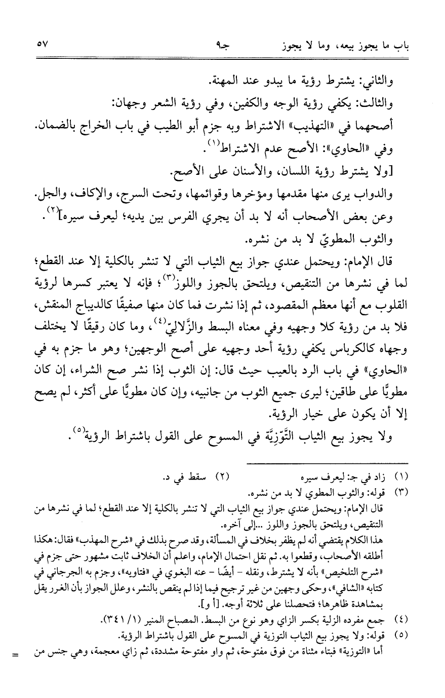 قال الإمام: ويحتمل عندي جواز بيع الثياب التي لا تنشر بالكلية إلا عند القطع؛ لما في نشرها من التنقيص، ويلتحق بالجوز واللوز؛ فإنه لا يعتبر كسرها لرؤية القلوب مع أنها معظم المقصود، ثم إذا نشرت فما كان منها صفيقاً كالديباج المنقش، فلابد من رؤية كلا وجهيه وفي معناه البسط والزَّلاليْ، وما كان رقيقاً لا يختلف وجهاه كالكرباس يكفي رؤية أحد وجهيه على أصح الوجهين؛ وهو ما جزم به في "الحاوي" في باب الرد بالعيب حيث قال: إن الثوب إذا نشر صح الشراء، إن كان مطويًّا على طاقين؛ ليرى جميع الثوب من جانبيه، وإن كان مطوياًّ على أكثر، لم يحص إلا أن يكون على خيار الرؤية.