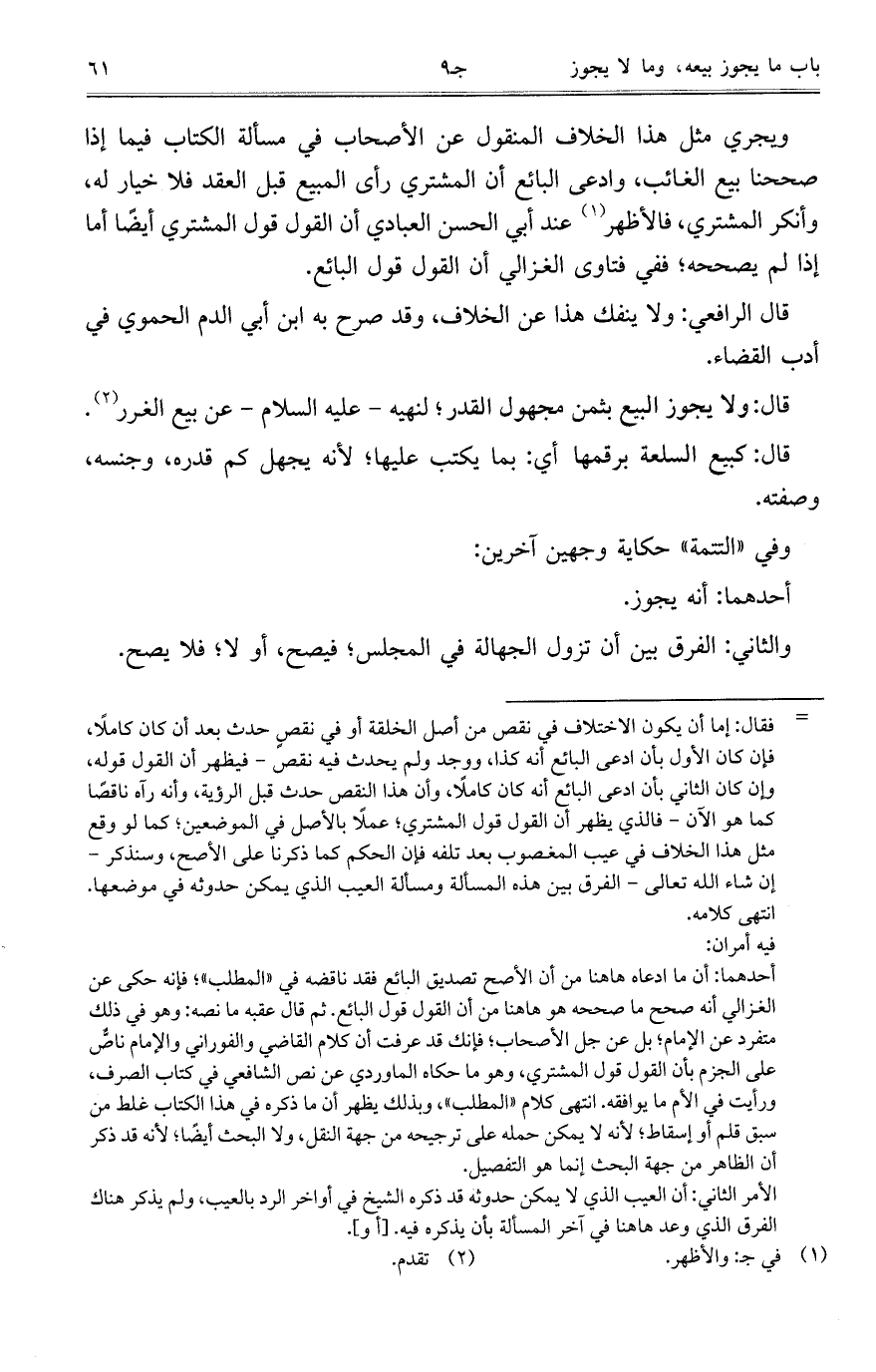 ويجري مثل هذا الخلاف المنقول عن الأصحاب في مسألة الكتاب فيما إذا صححنا بيع الغائب، وادعى البائع أن المشتري رأى المبيع قبل العقد فلا خيار له، وأنكر المشتري، فالأظهر عند أبي الحسن العبادي أن القول قول المشتري أيضاً أما إذا لم يصححه؛ ففي فتاوى الغزالي أن القول قول البائع.