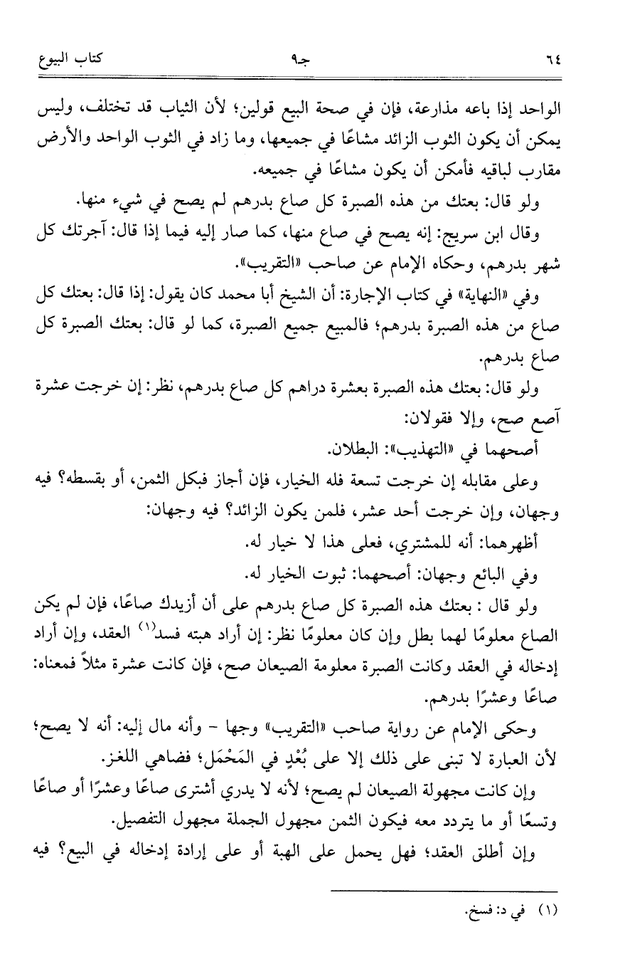 وفي "النهاية" في كتاب الإجارة: أن الشيخ أبا محمد كان يقول: إذا قال: بعتك كل صاع من هذه الصبرة بدرهم؛ فالمبيع جميع الصبرة، كما لو قال: بعتك الصبرة كل صاع بدرهم.