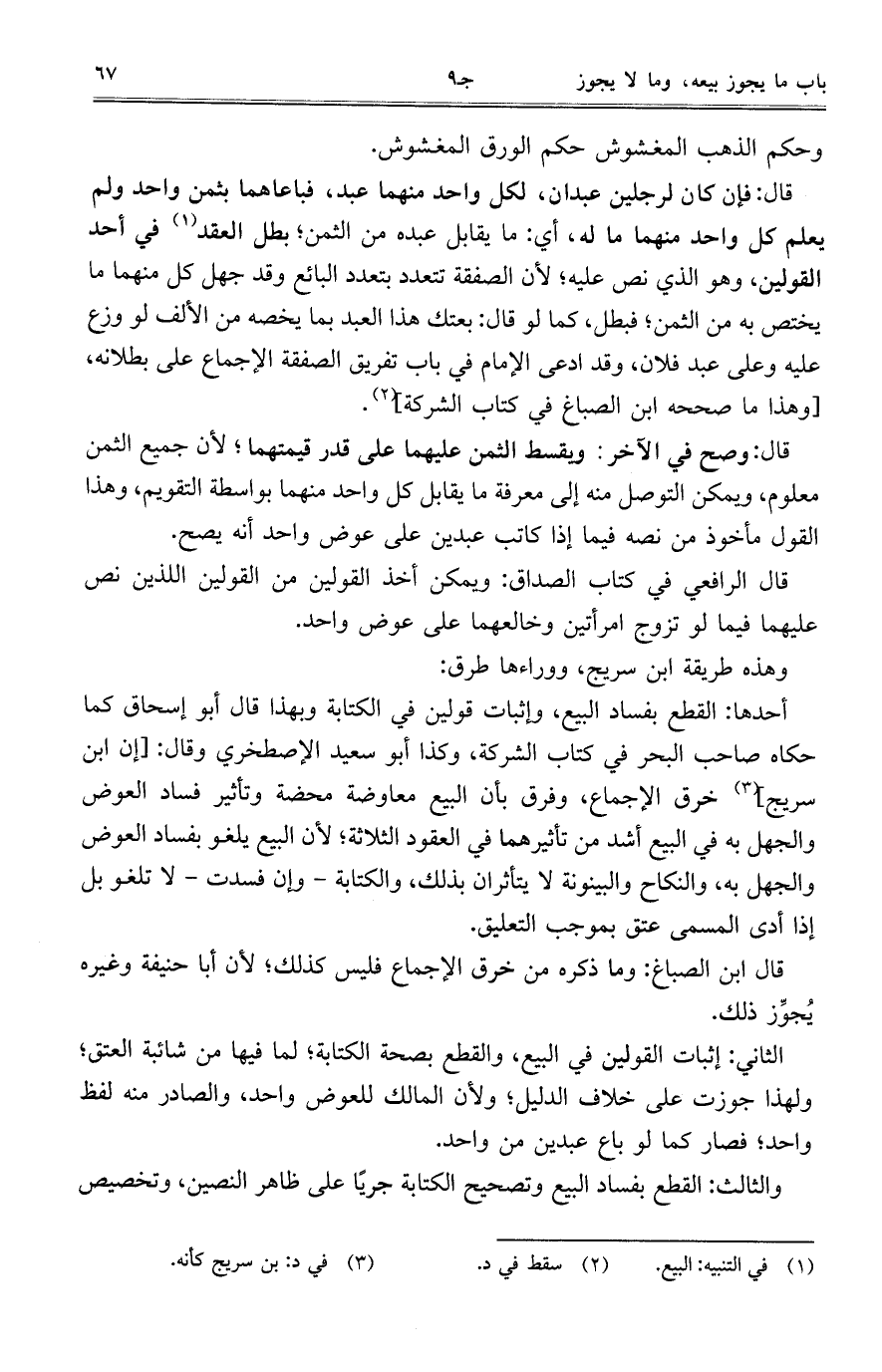 أحدها: القطع بفساد البيع، وإثبات قولين في الكتابة وبهذا قال أبو إسحاق كما حكاه صاحب البحر في كتاب الشركة، وكذا أبوسعيد الإصطخري وقال: [إن ابن سريج] خرق الإجماع، وفرق بأن البيع معاوضة محضة وتأثير فساد العوض والجهل به في البيع أشد من تأثيرهما في العقود الثلاثة؛ لأن البيع يلغو بفساد العوض والجهل به، والنكاح والبينونة لا يتأثران بذلك، والكتابة - وإن فسدت - لا تلغو بل إذا أدى المسمى عتق بموجب التعليق.