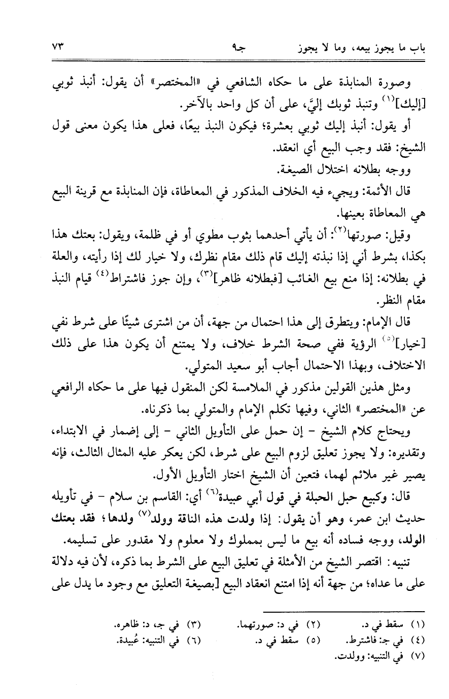 قال: وكبيع حبل الحبلة في قول أبي عبيدة أي: القاسم بن سلام – في تأويله حديث ابن عمر، وهو أن يقول: إذا ولدت هذه الناقة وولد ولدها؛ فقد بعتك الولد، ووجه فساده أنه بيع ما ليس بمملوك ولا معلوم ولا مقصور على تسليمه.