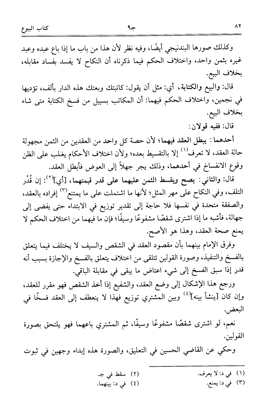 وفرق الإمام بينهما بأن مقصود العقد في الشقص والسيف لا يختلف فيما يتعلق بالفسخ والتنفيذ، وصورة القولين تتلقى من اختلاف يتعلق بالفسخ والإجازة بسبب أنه قدر إذا سبق الفسخ إلى شيء اعتاض ما يبقى في مقابلة الباقي.