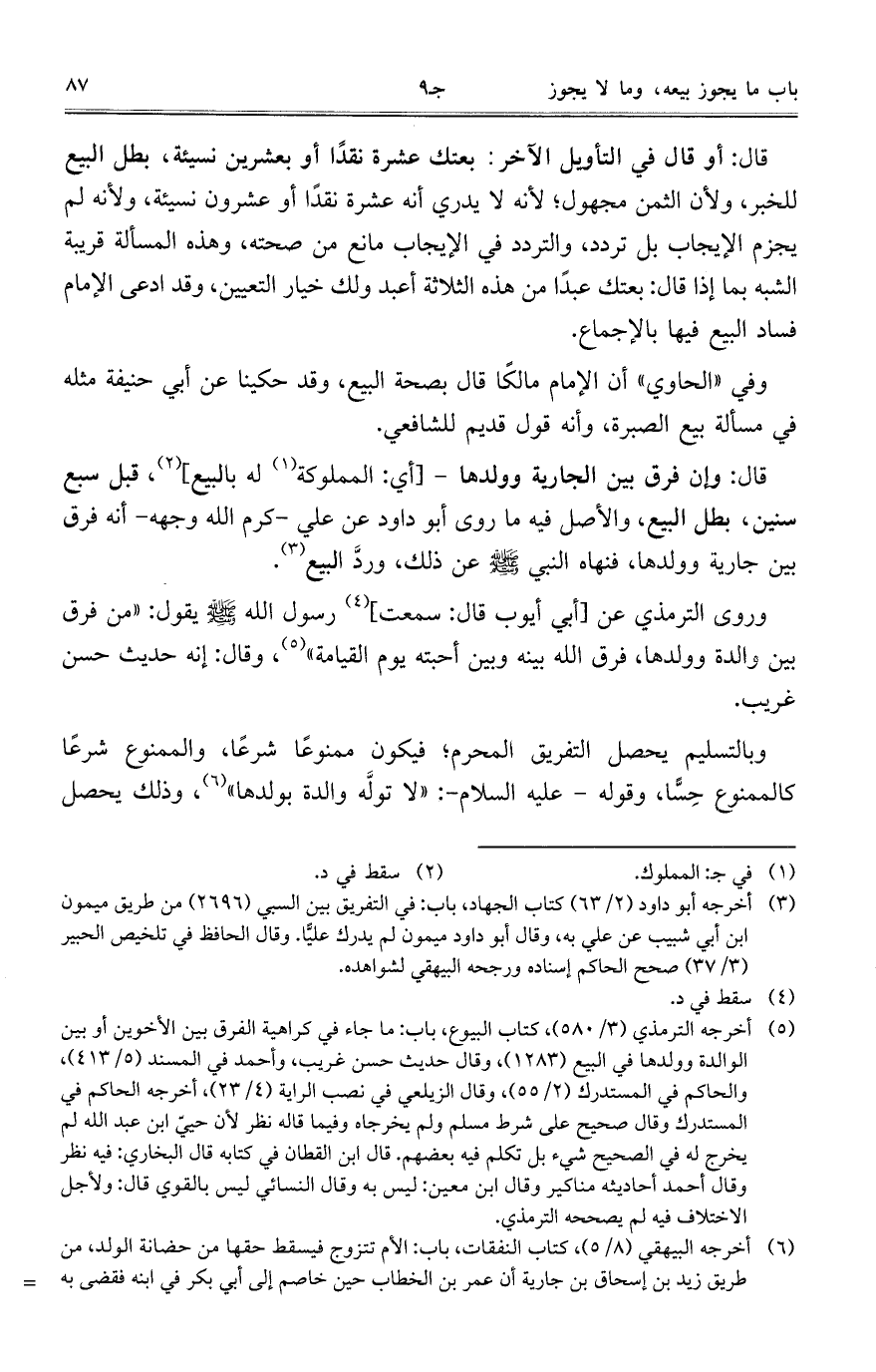 قال: وإن فرق بين الجارية وولدها – [أي: المملوكة له بالبيع]، قبل سبع سنين، بطل البيع، والأصل فيه ما روى أبو داود عن علي – كرم الله وجهه – أنه فرق بين جارية وولدها، فنهاه النبي صلى الله عليه وسلم عن ذلك، وردَّ البيع.
