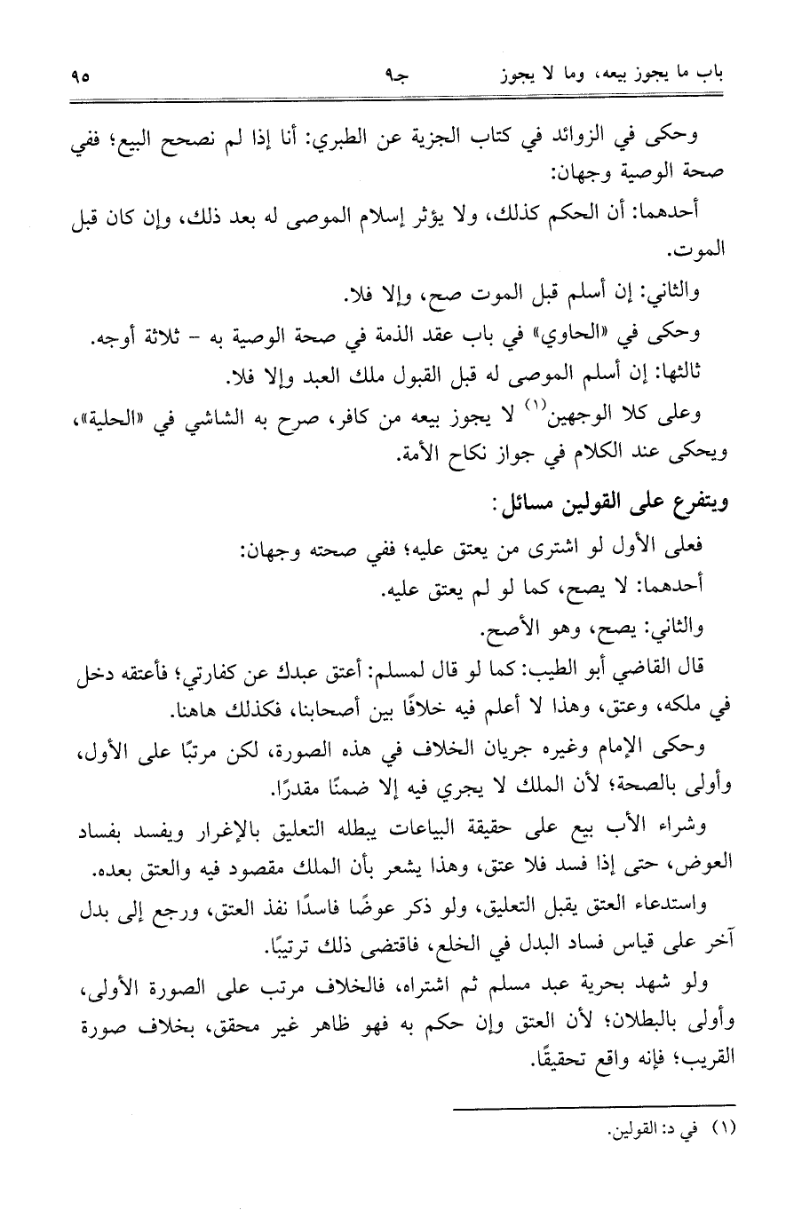 وعلى كلا الوجهين لا يجوز بيعه من كافر، صرح به الشاشي في "الحلية"، ويحكي عند الكلام في جواز نكاح الأمة.