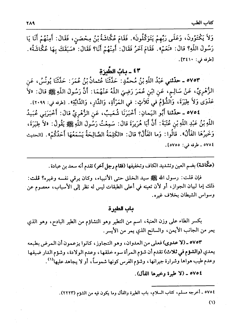 5753 - حَدَّثَنِى عَبْدُ اللَّهِ بْنُ مُحَمَّدٍ حَدَّثَنَا عُثْمَانُ بْنُ عُمَرَ حَدَّثَنَا يُونُسُ عَنِ الزُّهْرِىِّ عَنْ سَالِمٍ عَنِ ابْنِ عُمَرَ - رضى الله عنهما - أَنَّ رَسُولَ اللَّهِ - صلى الله عليه وسلم - قَالَ «لاَ عَدْوَى وَلاَ طِيَرَةَ، وَالشُّؤْمُ فِي ثَلاَثٍ فِي الْمَرْأَةِ، وَالدَّارِ، وَالدَّابَّةِ». طرفه 2099