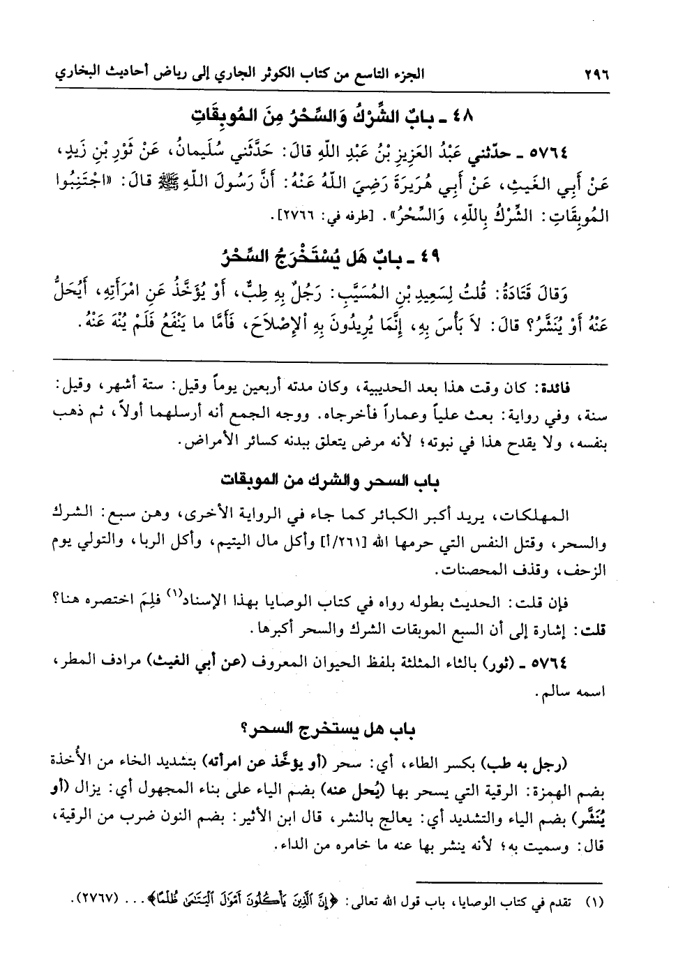 فإن قلت: الحديث بطوله رواه في كتاب الوصايا بهذا الإسناد فلِمَ اختصره هنا؟ قلت: إشارة إلى أن السبع الموبقات الشرك والسحر أكبرها.