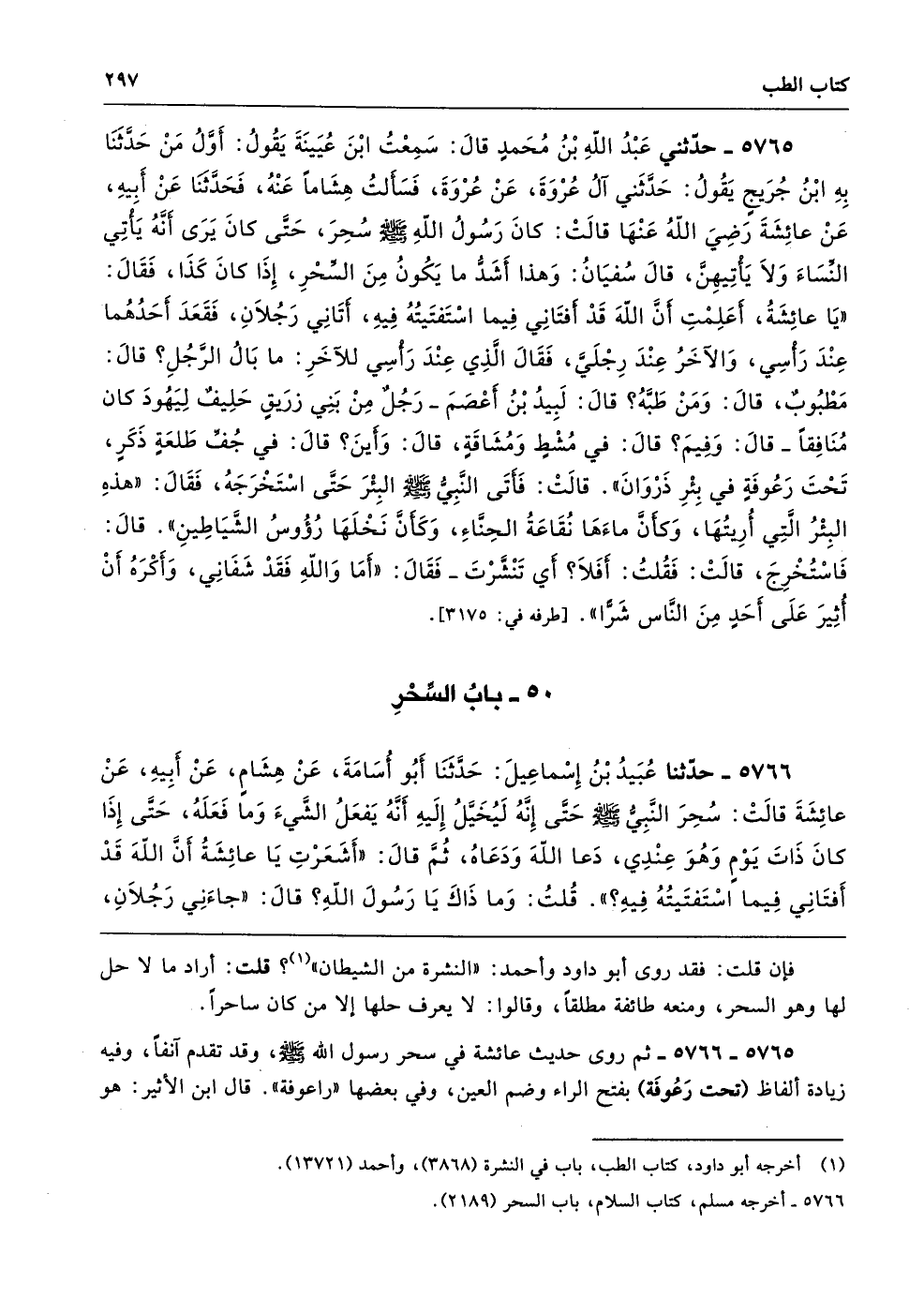 5765 - 5766 - ثم روى حديث عائشة في سحر رسول الله - صلى الله عليه وسلم -، وقد تقدم آنفًا، وفيه زيادة ألفاظ (تحث رَعُوفَة) بفتح الراء وضم العين، وفي بعضها "راعوفة". قال ابن الأثير: هو