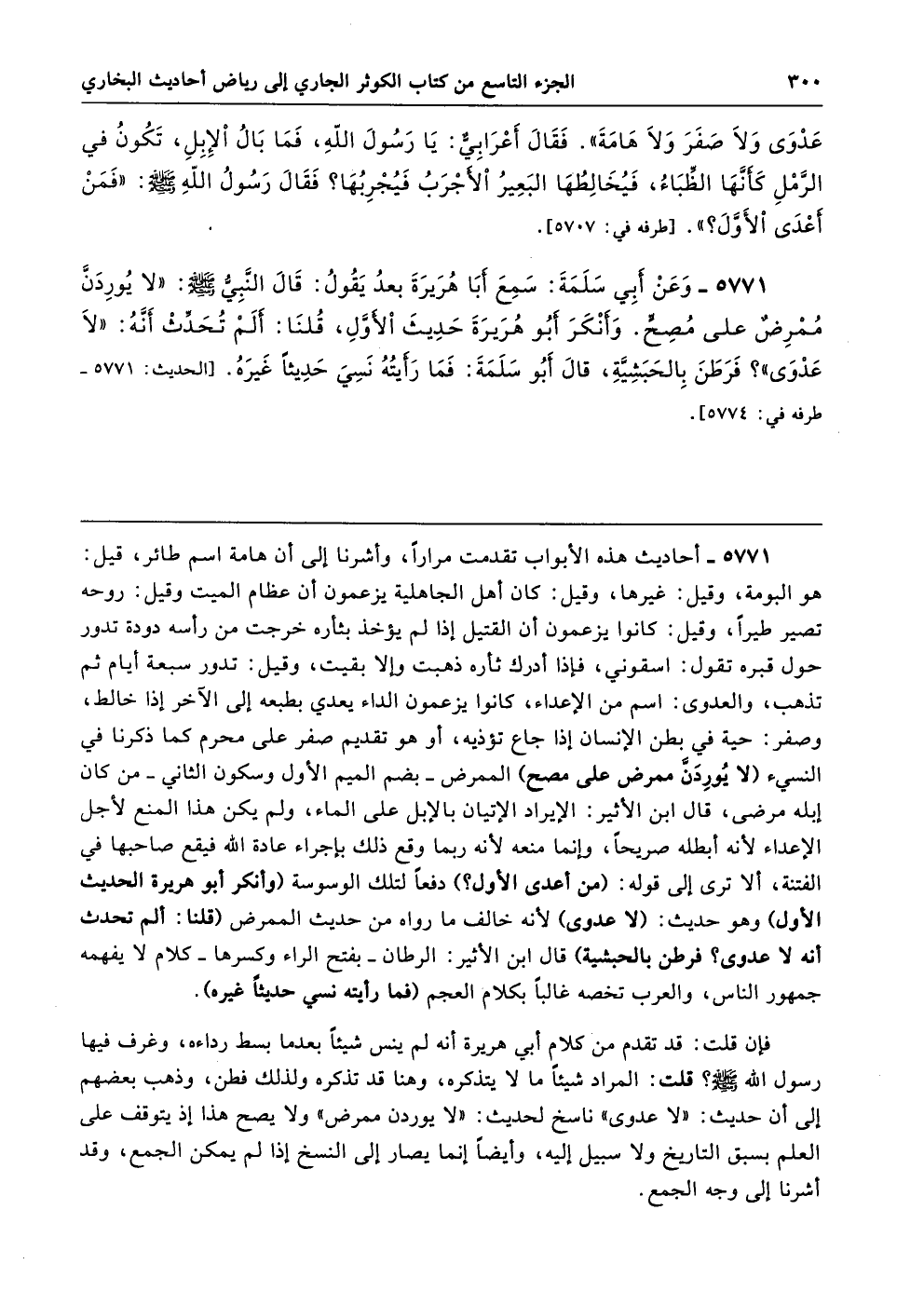 5771 - أحاديث هذه الأبواب تقدمت مرارًا، وأشرنا إلى أن هامة اسم طائر، قيل: هو البومة، وقيل: غيرها، وقيل: كان أهل الجاهلية يزعمون أن عظام الميت وقيل: روحه تصير طيرًا، وقيل: كانوا يزعمون أن القتيل إذا لم يؤخذ بثأره خرجت من رأسه دودة تدور حول قبره تقول: اسقوني، فإذا أدرك ثأره ذهبت وإلا بقيت، وقيل: تدور سبعة أيام ثم تذهب، والعدوى: اسم من الإعداء، كانوا يزعمون الداء يعدي بطبعه إلى الآخر إذا خالط، وصفر: حية في بطن الإنسان إذا جاع تؤذيه، أو هو تقديم صفر على محرم كما ذكرنا في النسيء (لا يُورِدَنَّ ممرض على مصح) الممرض -بضم الميم الأول وسكون الثاني- من كان إبله مرضى، قال ابن الأثير: الإيراد الإتيان بالإبل على الماء، ولم يكن هذا المنع لأجل الإعداء لأنه أبطله صريحًا، وإنما منعه لأنه ربما وقع ذلك بإجراء عادة الله فيقع صاحبها في الفتنة، ألا ترى إلى قوله: (من أعدى الأول؟) دفعًا لتلك الوسوسة (وأنكر أبو هريرة الحديث الأول) وهو حديث: (لا عدوى) لأنه خالف ما رواه من حديث الممرض (قلنا: ألم تحدث أنه لا عدوى؟ فرطن بالحبشية) قال ابن الأثير: الرطان -بفتح الراء وكسرها- كلام لا يفهمه جمهور الناس، والعرب تخصه غالبًا بكلام العجم (فما رأيته نسي حديثًا غيره).