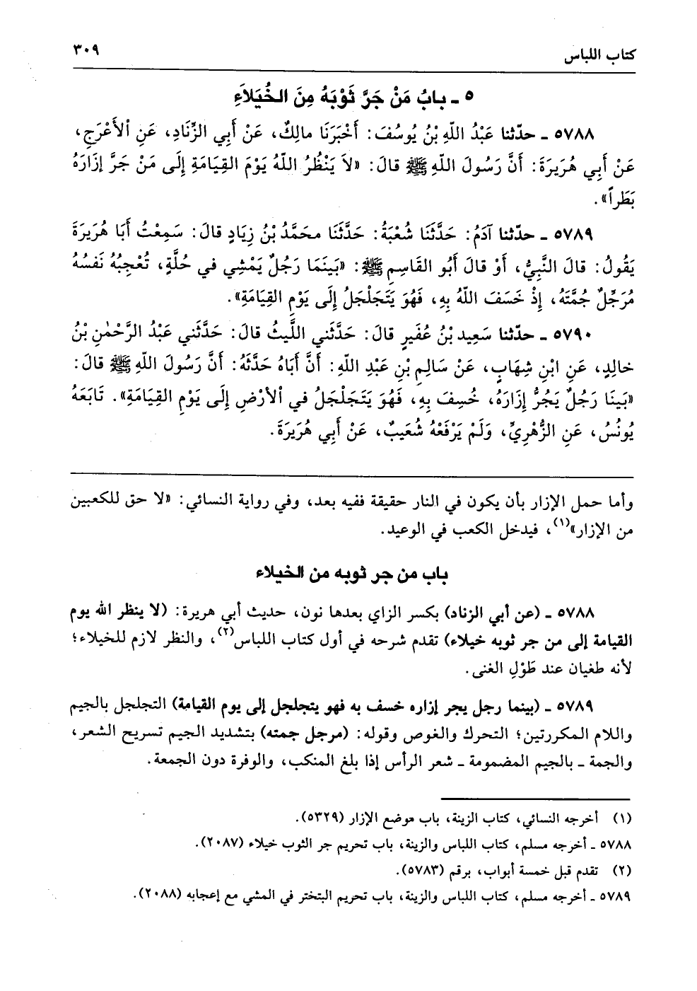 5788 - (عن أبي الزناد) بكسر الزاي بعدها نون، حديث أبي هريرة: (لا ينظر الله يوم القيامة إلى من جر ثوبه خيلاء) تقدم شرحه في أول كتاب اللباس، والنظر لازم للخيلاء؛ لأنه طغيان عند طَوْلِ الغنى.