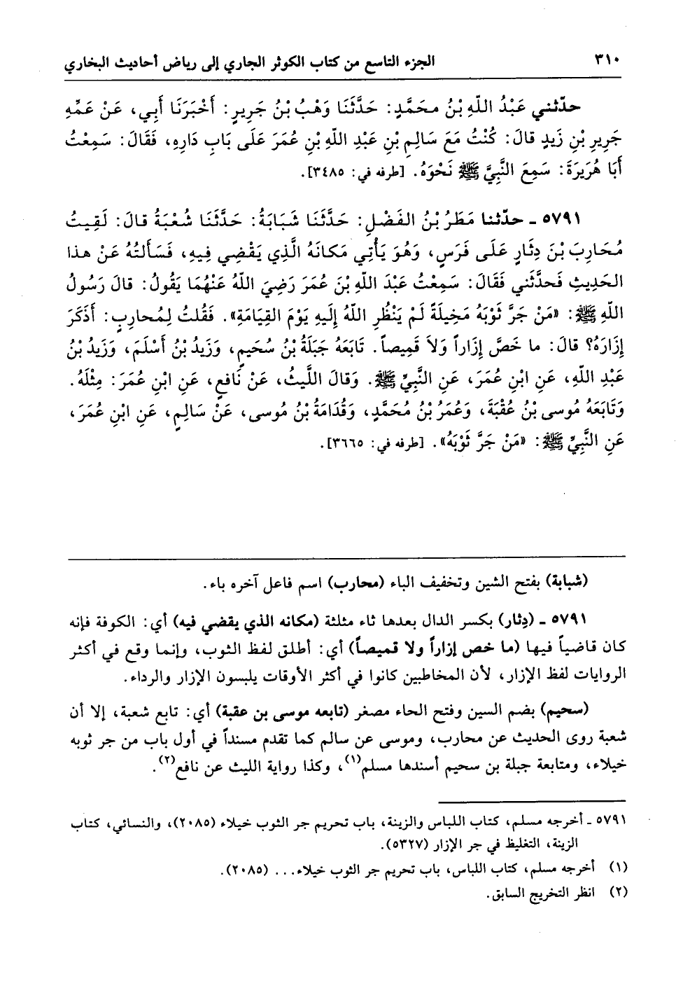 5791 - حَدَّثَنَا مَطَرُ بْنُ الْفَضْلِ حَدَّثَنَا شَبَابَةُ حَدَّثَنَا شُعْبَةُ قَالَ لَقِيتُ مُحَارِبَ بْنَ دِثَارٍ عَلَى فَرَسٍ وَهْوَ يَأْتِى مَكَانَهُ الَّذِى يَقْضِى فِيهِ فَسَأَلْتُهُ عَنْ هَذَا الْحَدِيثِ فَحَدَّثَنِى فَقَالَ سَمِعْتُ عَبْدَ اللَّهِ بْنَ عُمَرَ - رضى الله عنهما - يَقُولُ قَالَ رَسُولُ اللَّهِ - صلى الله عليه وسلم - «مَنْ جَرَّ ثَوْبَهُ مَخِيلَةً، لَمْ يَنْظُرِ اللَّهُ إِلَيْهِ يَوْمَ الْقِيَامَةِ». فَقُلْتُ لِمُحَارِبٍ أَذَكَرَ إِزَارَهُ قَالَ مَا خَصَّ إِزَارًا وَلاَ قَمِيصًا. تَابَعَهُ جَبَلَةُ بْنُ سُحَيْمٍ وَزَيْدُ بْنُ أَسْلَمَ وَزَيْدُ بْنُ عَبْدِ اللَّهِ عَنِ ابْنِ عُمَرَ عَنِ النَّبِيِّ - صلى الله عليه وسلم -. وَقَالَ اللَّيْثُ عَنْ نَافِعٍ عَنِ ابْنِ عُمَرَ مِثْلَهُ. وَتَابَعَهُ مُوسَى بْنُ عُقْبَةَ وَعُمَرُ بْنُ مُحَمَّدٍ وَقُدَامَةُ بْنُ مُوسَى عَنْ سَالِمٍ عَنِ ابْنِ عُمَرَ عَنِ النَّبِيِّ - صلى الله عليه وسلم - «مَنْ جَرَّ ثَوْبَهُ». طرفه 3665
