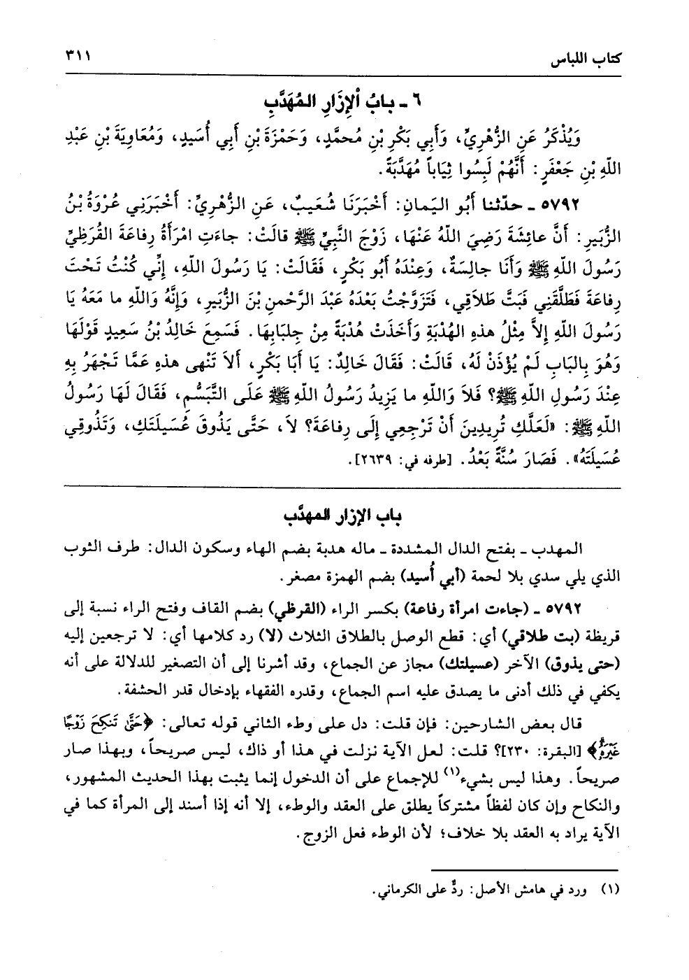 5792 - حَدَّثَنَا أَبُو الْيَمَانِ أَخْبَرَنَا شُعَيْبٌ عَنِ الزُّهْرِىِّ أَخْبَرَنِى عُرْوَةُ بْنُ الزُّبَيْرِ أَنَّ عَائِشَةَ - رضى الله عنها - زَوْجَ النَّبِيِّ - صلى الله عليه وسلم - قَالَتْ جَاءَتِ امْرَأَةُ رِفَاعَةَ الْقُرَظِىِّ رَسُولَ اللَّهِ - صلى الله عليه وسلم - وَأَنَا جَالِسَةٌ وَعِنْدَهُ أَبُو بَكْرٍ فَقَالَتْ يَا رَسُولَ اللَّهِ إِنِّى كُنْتُ تَحْتَ رِفَاعَةَ فَطَلَّقَنِى فَبَتَّ طَلاَقِى، فَتَزَوَّجْتُ بَعْدَهُ عَبْدَ الرَّحْمَنِ بْنَ الزَّبِيرِ، وَإِنَّهُ وَاللَّهِ مَا مَعَهُ يَا رَسُولَ اللَّهِ إِلاَّ مِثْلُ هَذِهِ الْهُدْبَةِ.