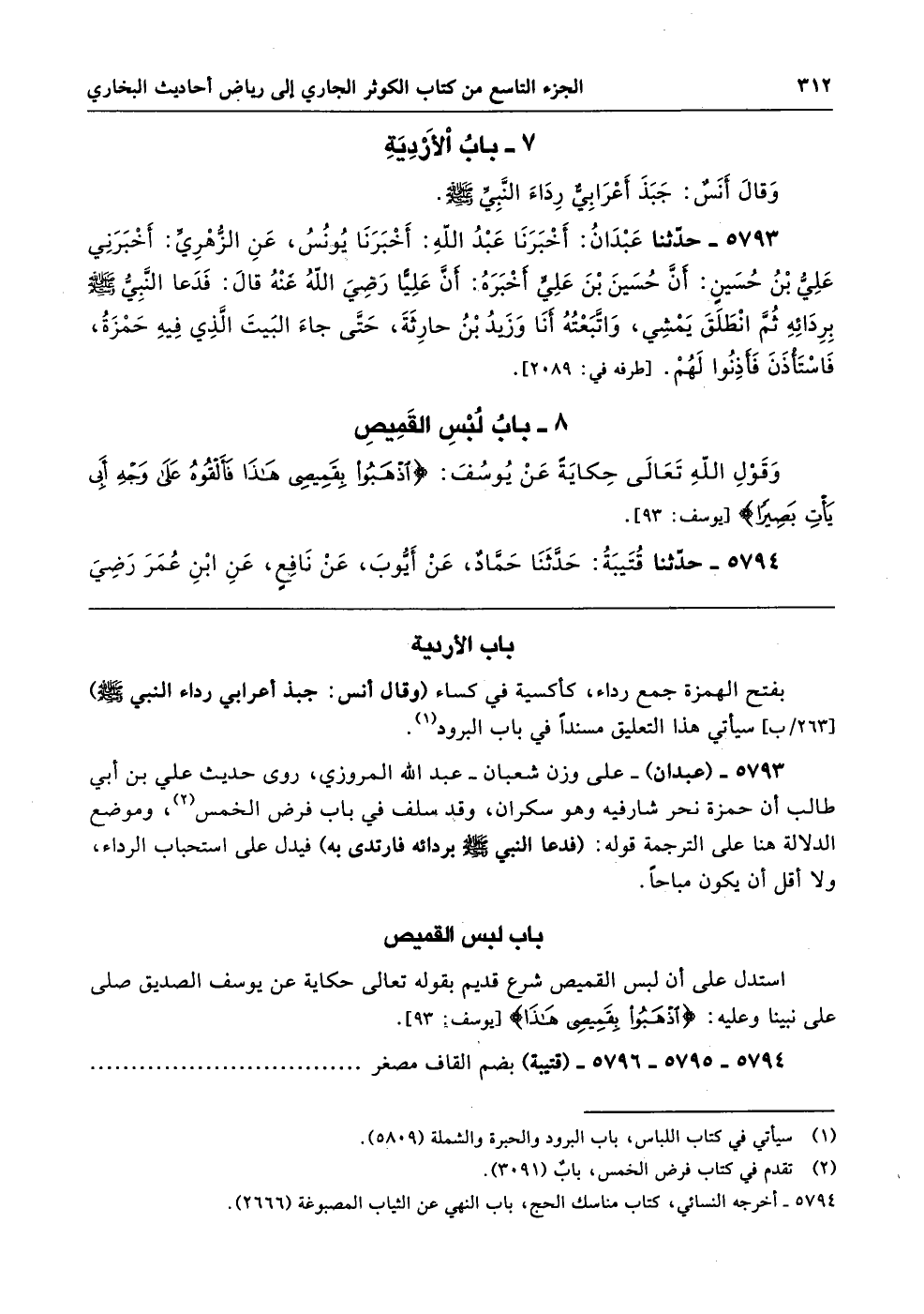 5793 - (عبدان) -على وزن شعبان- عبد الله المروزي، روى حديث علي بن أبي طالب أن حمزة نحر شارفيه وهو سكران، وقد سلف في باب فرض الخمس، وموضع الدلالة هنا على الترجمة قوله: (فدعا النبي - صلى الله عليه وسلم - بردائه فارتدى به) فيدل على استحباب الرداء، ولا أقل أن يكون مباحًا.