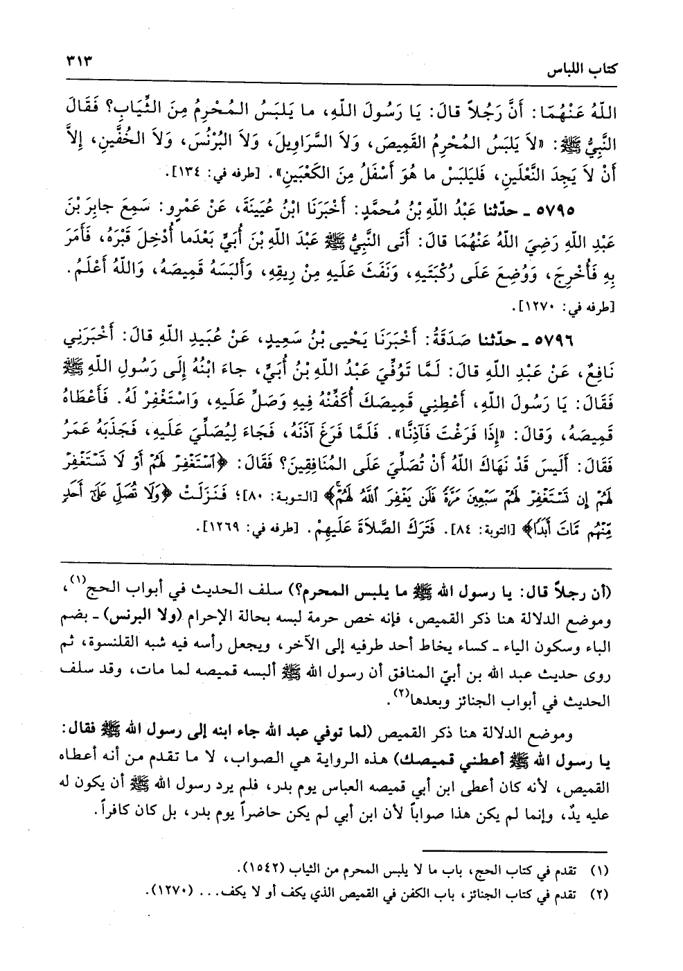(أن رجلًا قال: يا رسول الله - صلى الله عليه وسلم - ما يلبس المحرم؟) سلف الحديث في أبواب الحج، وموضع الدلالة هنا ذكر القميص، فإنه خص حرمة لبسه بحالة الإحرام (ولا البرنس) -بضم الباء وسكون الياء- كساء يخاط أحد طرفيه إلى الآخر، ويجعل رأسه فيه شبه القلنسوة، ثم روى حديث عبد الله بن أبي المنافق أن رسول الله - صلى الله عليه وسلم - ألبسه قميصه لما مات، وقد سلف الحديث في أبواب الجنائز وبعدها.